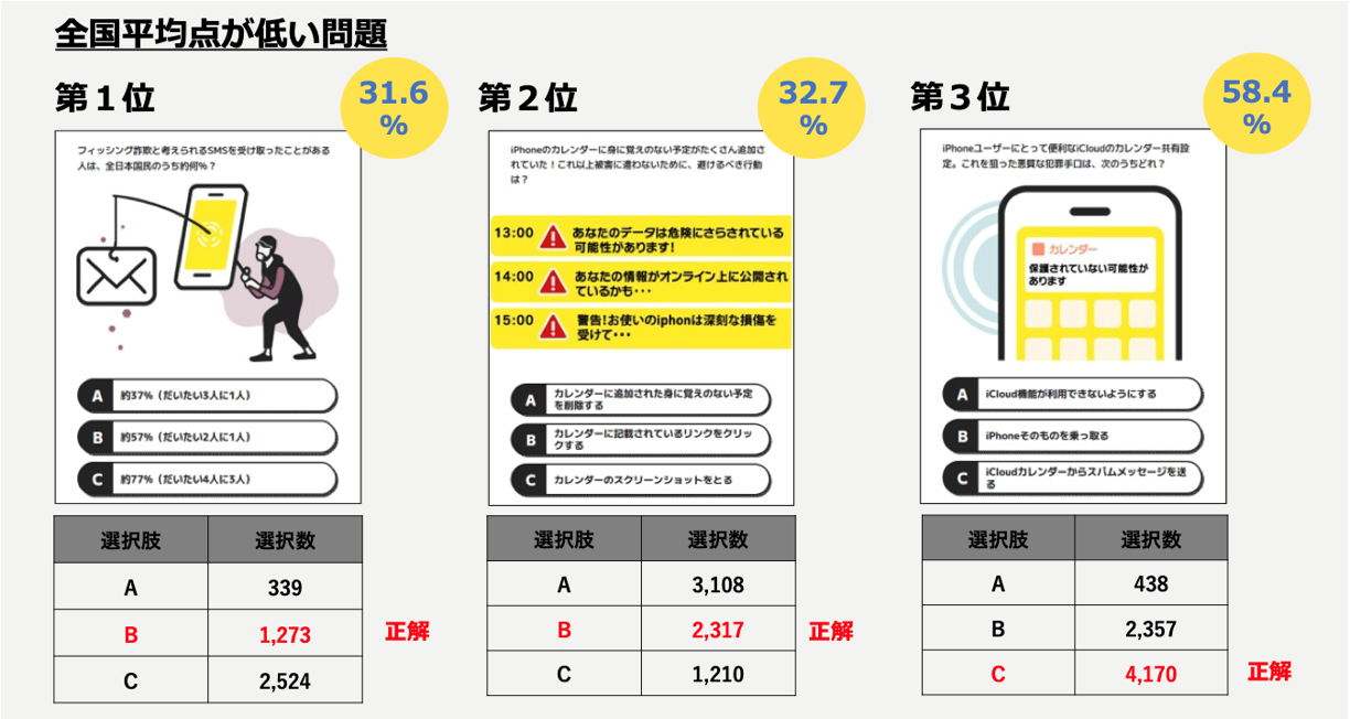 正答率が最も低かった問題は以下の通りです。1位は31.6%、2位は32.7%、3位は58.4%の正答率となりました。