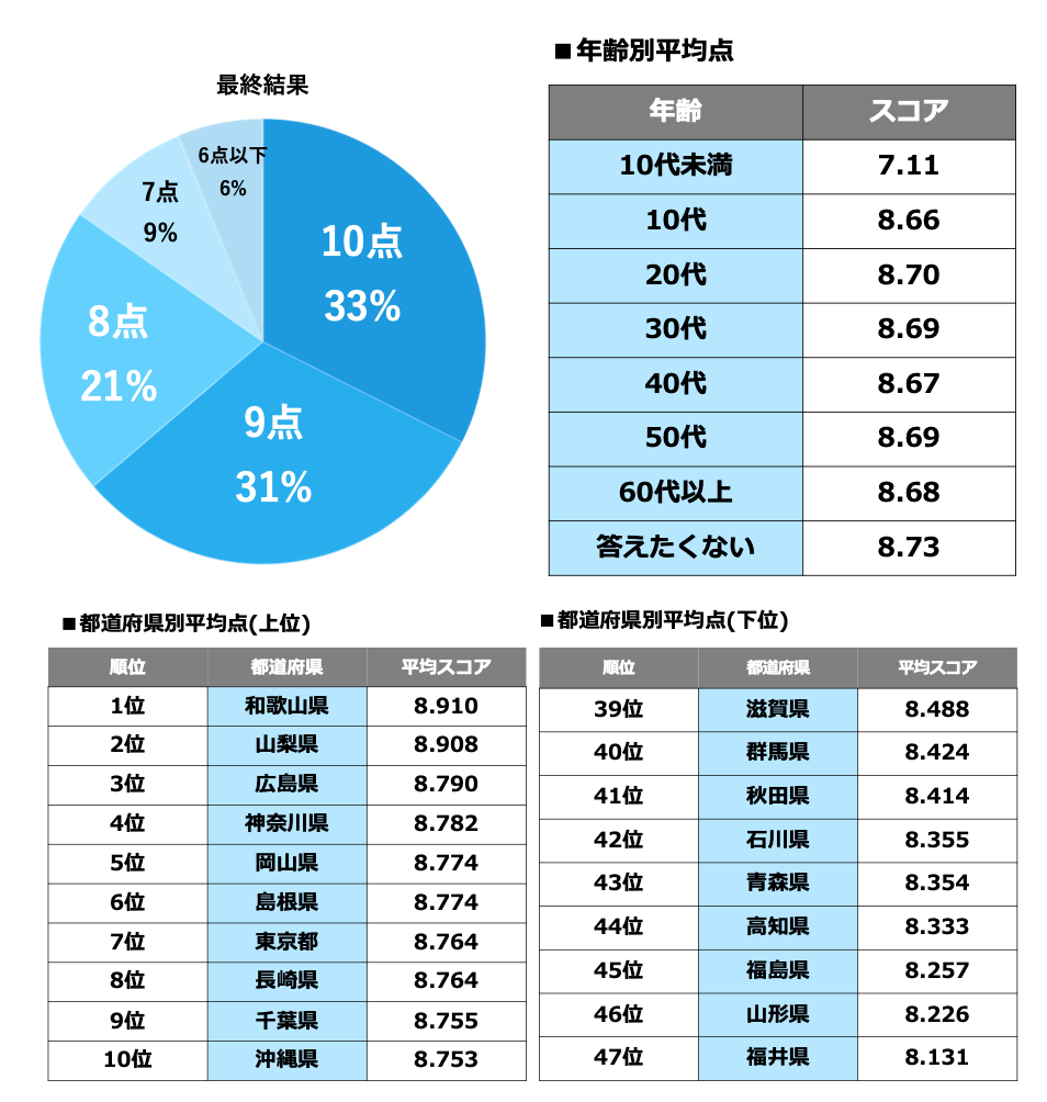 クイズ参加者の約32%が10点満点、約31%が9点、約21%が8点、参加者全体の平均点は8.7点と、高得点を獲得する参加者が多い結果となりました。年代別で比較しても大きな差はなく、10代未満のみ平均点7.11点と、他の世代と比較し低い結果となりました。