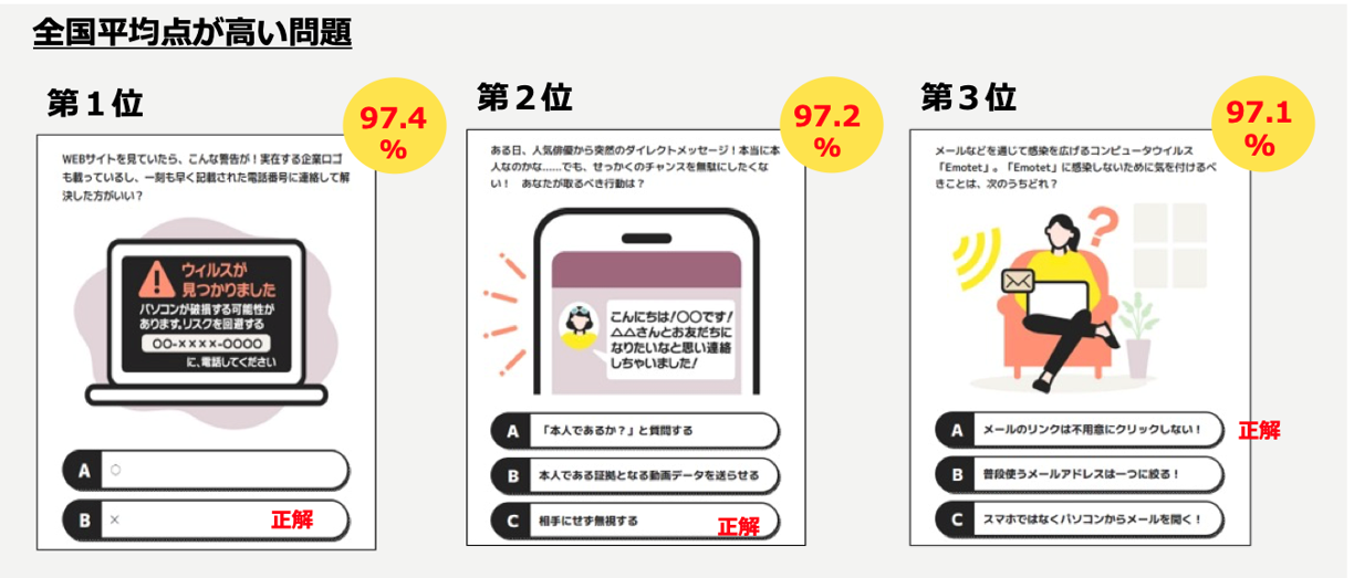 全国平均点の高い傾向にあったクイズは以下の通りです。1位は97.4%、2位は97.2%、3位は97.1%の正答率となりました。