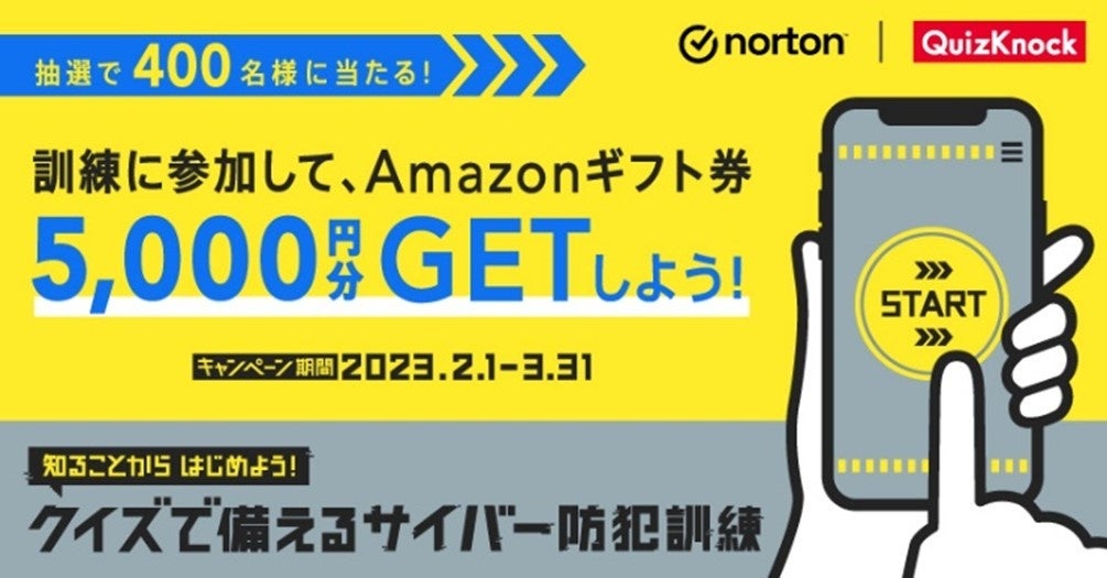 Twitterにて3月31日(金)までの期間、プレゼントキャンペーンを実施しております。ノートン公式Twitterアカウント(@NortonJapan)をフォローの上、サイバー防犯訓練に参加し、その結果をシェア(ツイート)いただいた方の中から抽選で400名様に、Amazonギフト券5,000円分をプレゼントいたします。