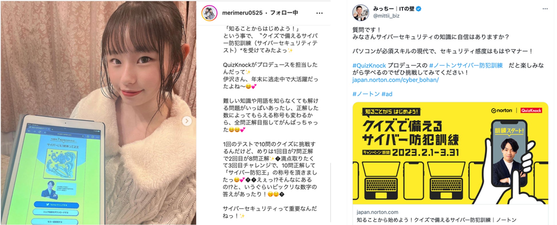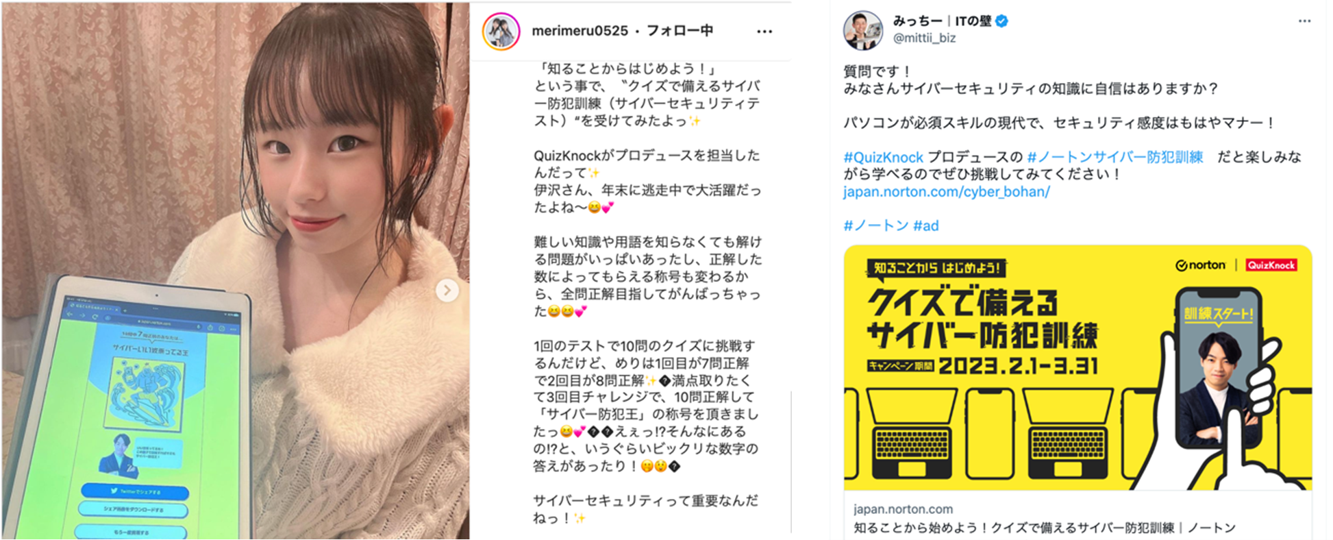 消費者向けセキュリティブランド「ノートン™」は、2月1日(水)から3月18日(土)までの「サイバーセキュリティ月間」に合わせ、消費者のサイバー犯罪に対するセキュリティ知識向上を目的としたクイズコンテンツ「知ることからはじめよう!クイズで備えるサイバー防犯訓練」を、2月1日(水)より特設サイトにて公開し、開始から約3週間で全国約25,000人がクイズに参加しました。本クイズには多分野のインフルエンサーが参加した他、学校法人角川ドワンゴ学園N高等学校・S高等学校 横浜キャンパスにて、本クイズを活用したサイバー犯罪対策に関する特別授業「ノートンのサイバー防犯訓練体験会」を実施し、395名の生徒が参加しました。本企画は、クイズ王伊沢拓司率いる東大発の知識集団「QuizKnock」プロデュースにより実施しております。