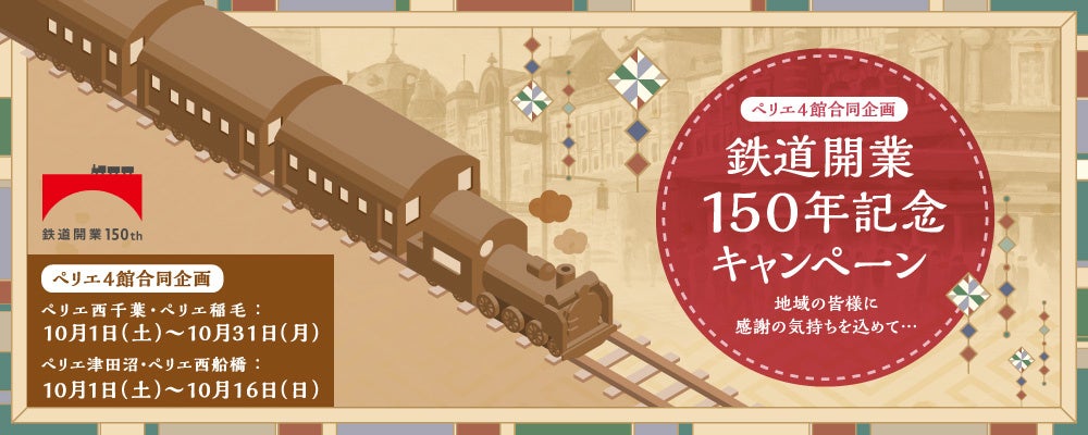 ペリエ稲毛・西千葉・津田沼・西船橋4館合同で記念すべき鉄道開業150年を盛り上げます。鉄道にちなんだ特別な商品やみなさまに楽しんでいただける企画をお届けいたします。