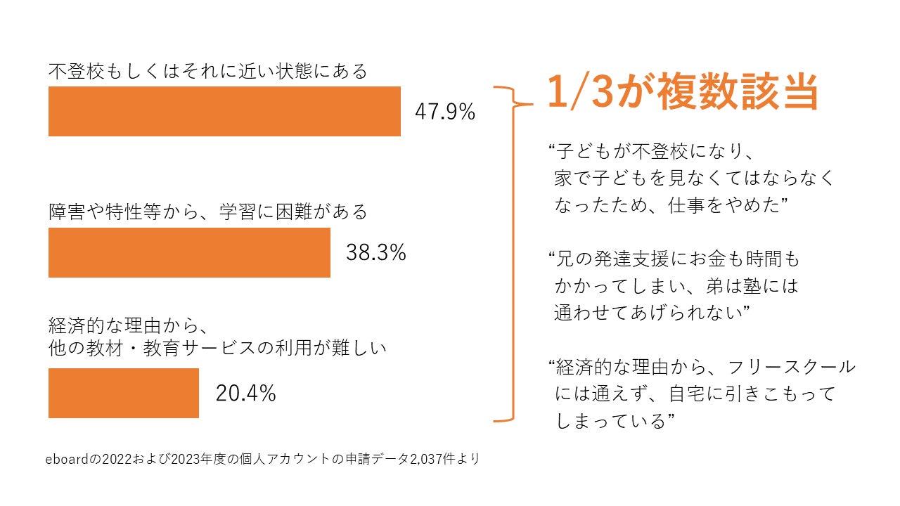 eboardでは、様々な事情を抱える子を対象に、ICT教材eboardの個人アカウントを無料で発行してきました。個人で利用する子のうち、47.9%が不登校、38.3%が障害などによる学習困難、20.4%が経済的困難を抱えており、これらが重複する子も少なくありません。