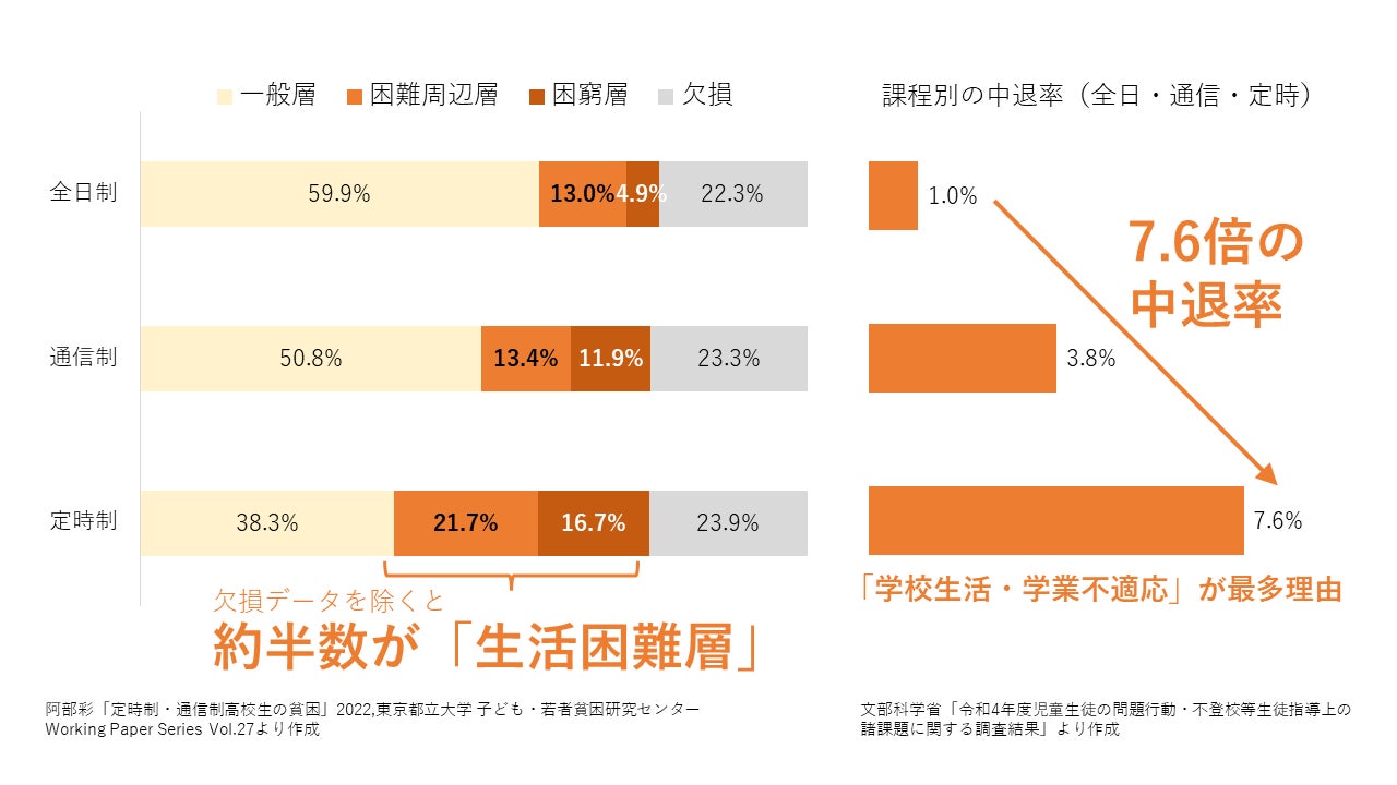 定時制の生徒のうち、(欠損データを除くと)約半数が生活困難層です(出典:阿部彩「定時制・通信制高校生の貧困」2022,東京都立大学 子ども・若者貧困研究センターWorking Paper Series Vol.27)。また中退率は、全日制と比較して、通信制が3.8倍、定時制が7.6倍となっており、その理由は「学校生活、学業不適応」が最多となっています(出典:文部科学省「令和4年度児童生徒の問題行動・不登校等生徒指導上の諸課題に関する調査結果」)。中退は、その後の就業、収入などへの影響が大きく、経済的自立、困難からの脱却には、高校教育環境の充実が欠かせません。
