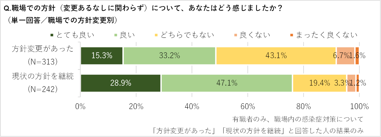 職場の対応について、「現状の方針を継続」は約8割が良いと評価したのに対し、「方針変更あり」を良いと評