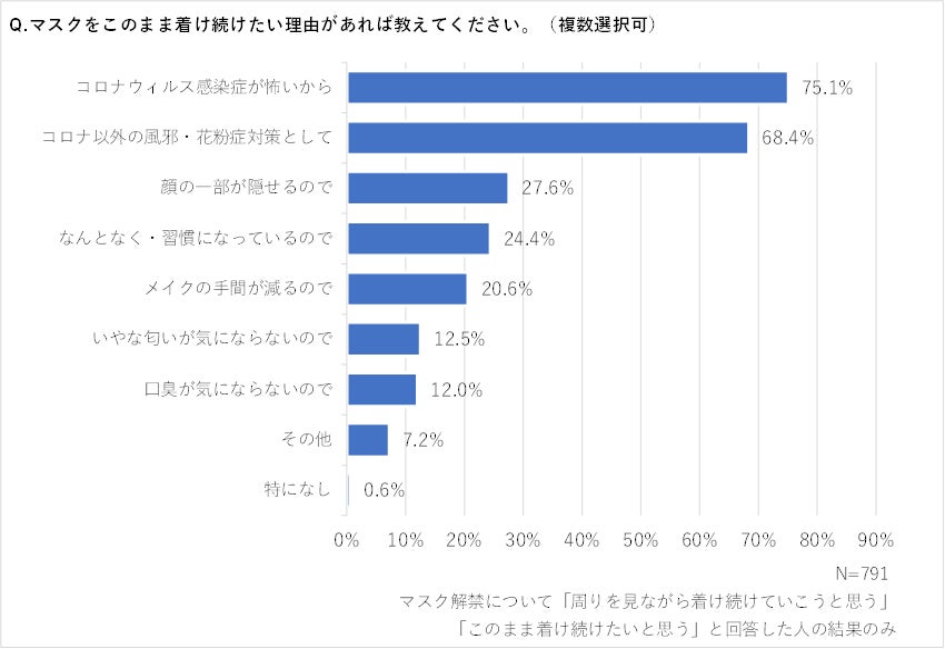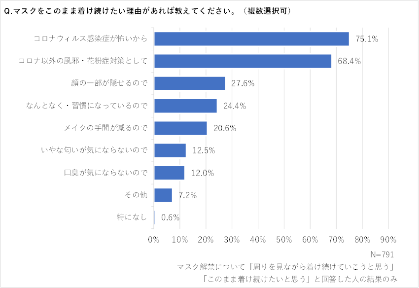 ・マスクを着け続けたい理由は「コロナウィルス感染症が怖い」「風邪・花粉症対策」