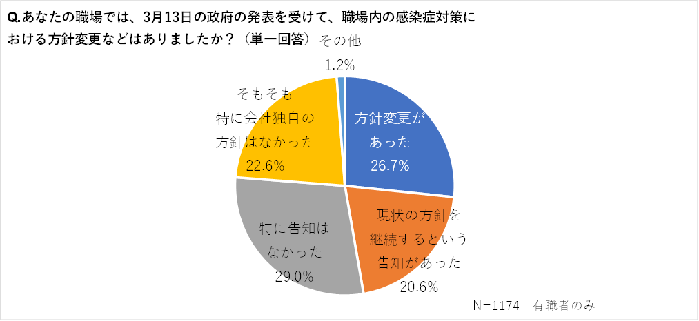 ・3月13日以降の職場内の感染症対策について、「方針変更あり」が約3割で、「現状の方針を継続」は約2割。