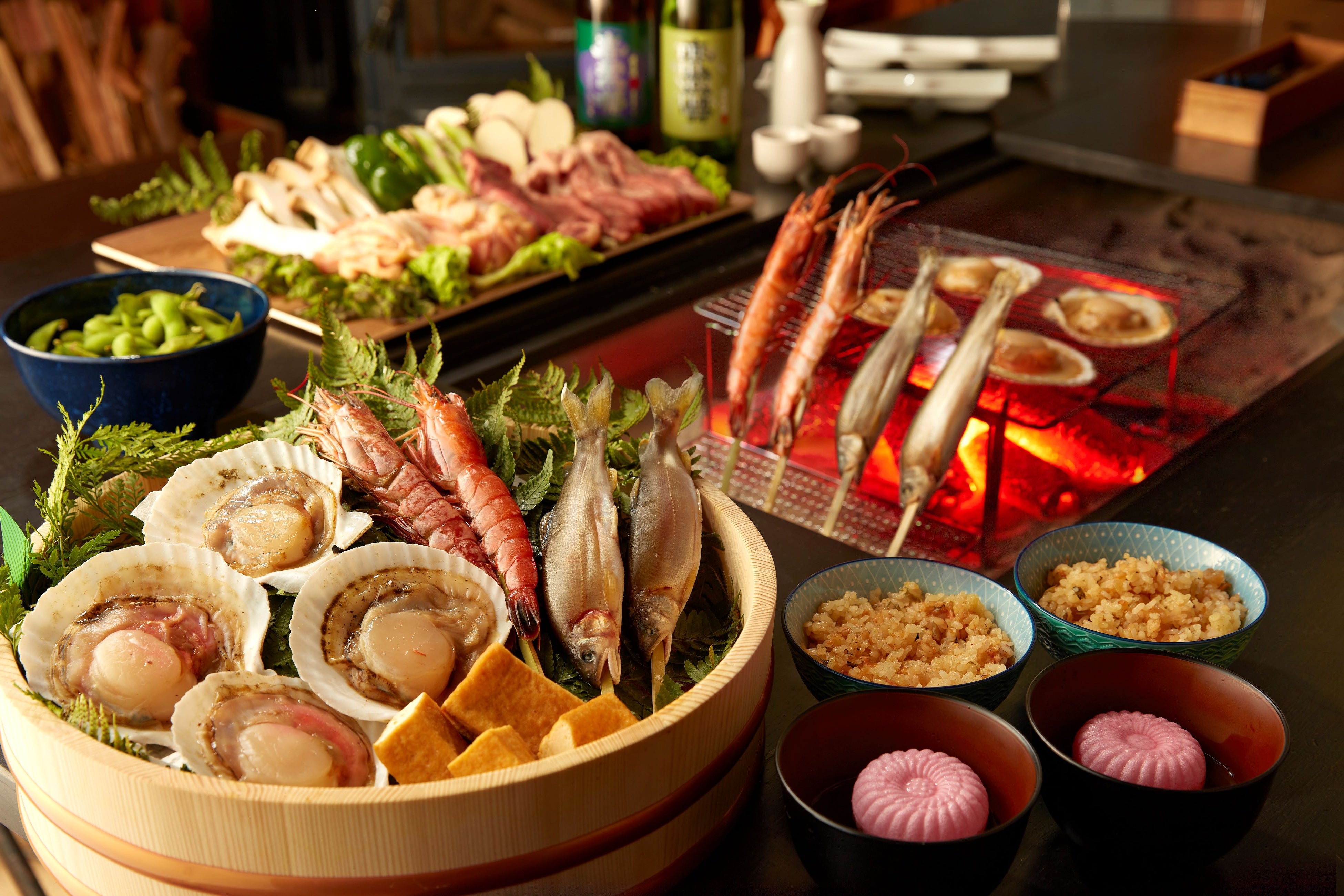 日本の文化を味わい囲炉裏を囲ってお食事を楽しめるメニューをご用意いたしました。地元の新鮮な食材をお楽しみいただけます。