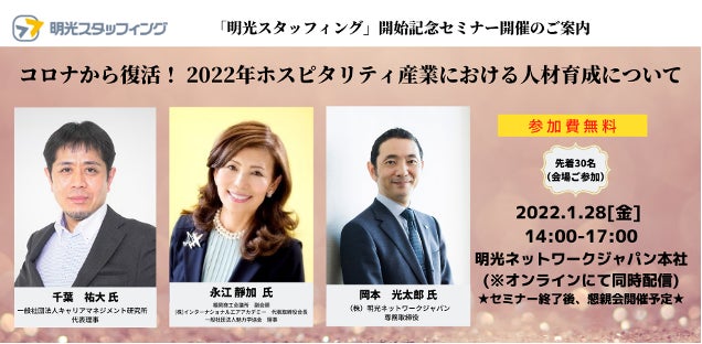 人材派遣サービス「明光スタッフィング」を展開する株式会社明光ネットワークジャパン(東京都新宿区、代表取締役社長:山下 一仁、以下、明光ネットワークジャパン)は、2022年1月28日(金)に、無料オンラインセミナー「コロナから復活! 2022年ホスピタリティ産業の最新事情と人材育成について」を開催いたします。
