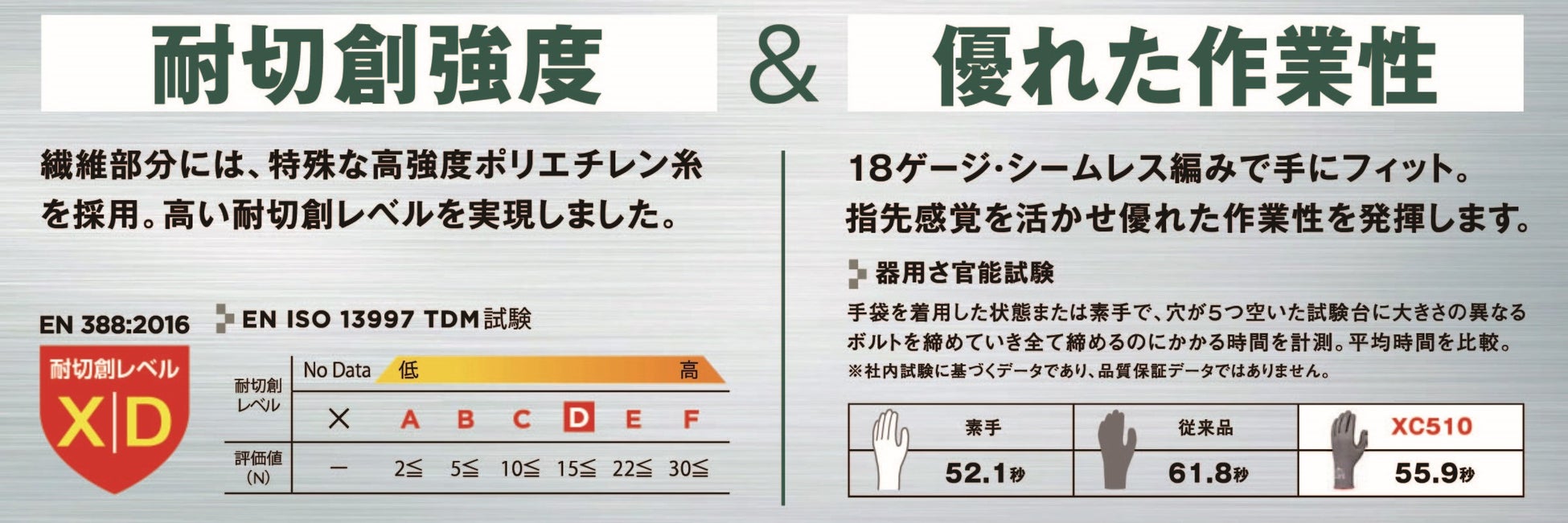 ※1:EN 388:2016+A1:2018規格 EN ISO 13997 TDM試験による耐切創レベルD