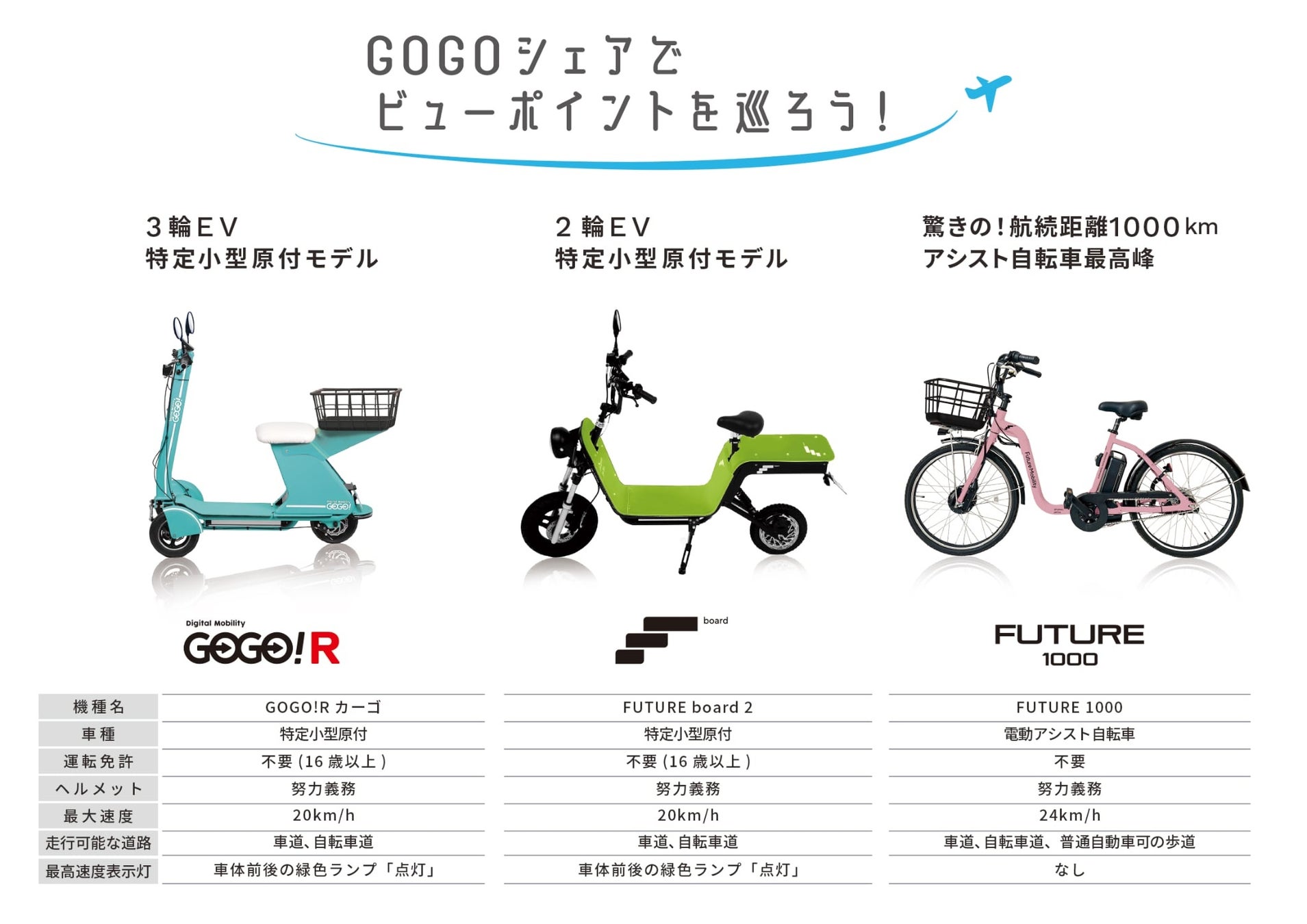 関西万博や瀬戸内国際芸術祭など国内外からの来訪者が誰でも乗りやすい観光回遊モビリティとして、大阪国際(伊丹)空港(https://www.osaka-airport.co.jp/service/notices/ev_bike_gogo )や、瀬戸内国際芸術祭が開催されている小豆島、豊島、香川県の各市町村で「GOGO!シェア」アプリからも特定小型原動機付自転車「GOGO!R」や「FUTURE board2」,航続距離1000kmのパワフル電動アシスト自転車「FUTURE1000」などが利用できる。