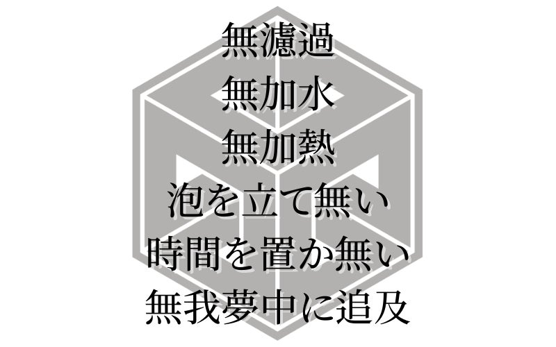 楯の川酒造における生酒シリーズ「楯野川無我」。6つの「無」(無濾過・無加水・無加熱・泡を立てない・時間を置かない・無我夢中に追求)を重ねて、酒を搾った直後に蔵元でしか味わえない生きた酒の味わいと香りを再現しました。濃厚な旨味を持つフレッシュな生原酒を酒を搾った当日に、自然な発泡感を逃さないよう特殊な方法で瓶詰めし、すぐに冷蔵庫へ移して順次出荷します。