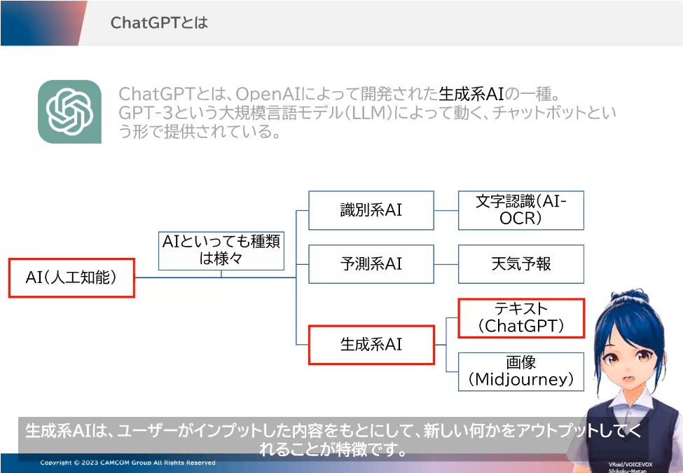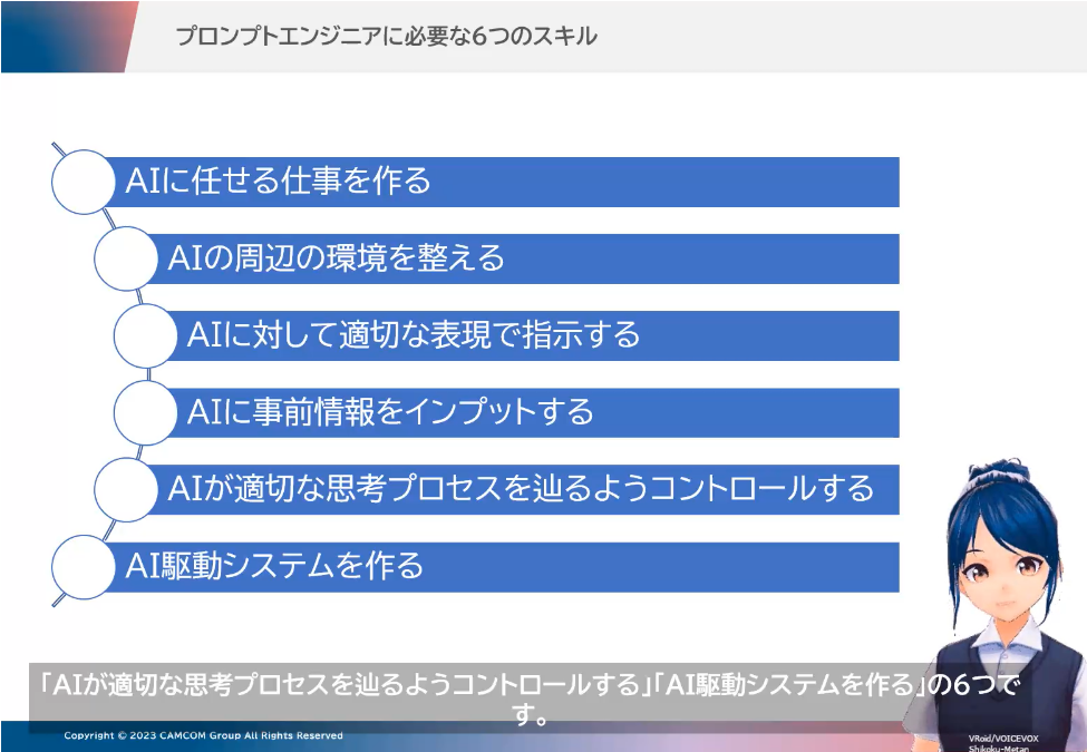 綜合キャリアオプションのプロンプトエンジニア養成講座は、開発エンジニアとして活躍してきた方々だけではなく、これまでAIを触ってこなかった方、システムについてわからないという方の受講も推奨しています。実際のカリキュラムもChatGPTやプロンプトエンジニアリングの基本的知識から初期設定、実際の使用方法や事例などをAIによる動画にてわかりやすく解説するなど、初心者から中級者以上の幅広い層に対応したカリキュラムを用意しています。