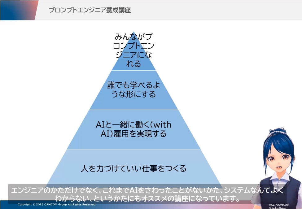 このChatGPTの運用を行うプロンプトエンジニアの育成をはかろうと今回、「プロンプトエンジニア養成講座」もスタート。すでに海外では専門職として認知されているプロンプトエンジニア、これからChatGPTが広く活用されていこうとする中で「みんながプロンプトエンジニアになれる世界を実現すること」をテーマに、日本でもプロンプトエンジニアとしての知識やスキルを持った人材を増やしていくことを目指します。