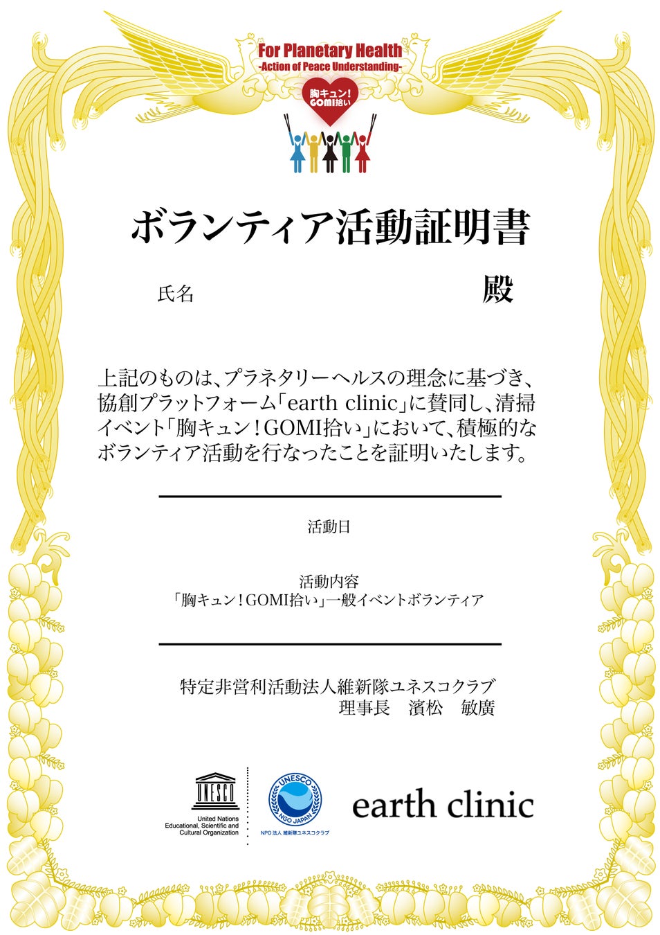 NPO法人維新隊ユネスコクラブ(理事長:濱松敏廣)とTHE J.V.株式会社(代表取締役:小磯卓也)は、複数の医療従事者と協力して、「ちきゅうの健康。わたしたちの健康。をつなぐ協創プラットフォーム『earth clinic』(http://earth-clinic.com/)」を開始いたしました。そこで私たちは、プラネタリーヘルスの理念に基づき2025年5月31日(土)、「ゴミゼロの日」にちなんだ清掃活動を行います。ゴミゼロの日を皮切りに、楽しみながら社会貢献活動に参加したい方に向けたイベントです。