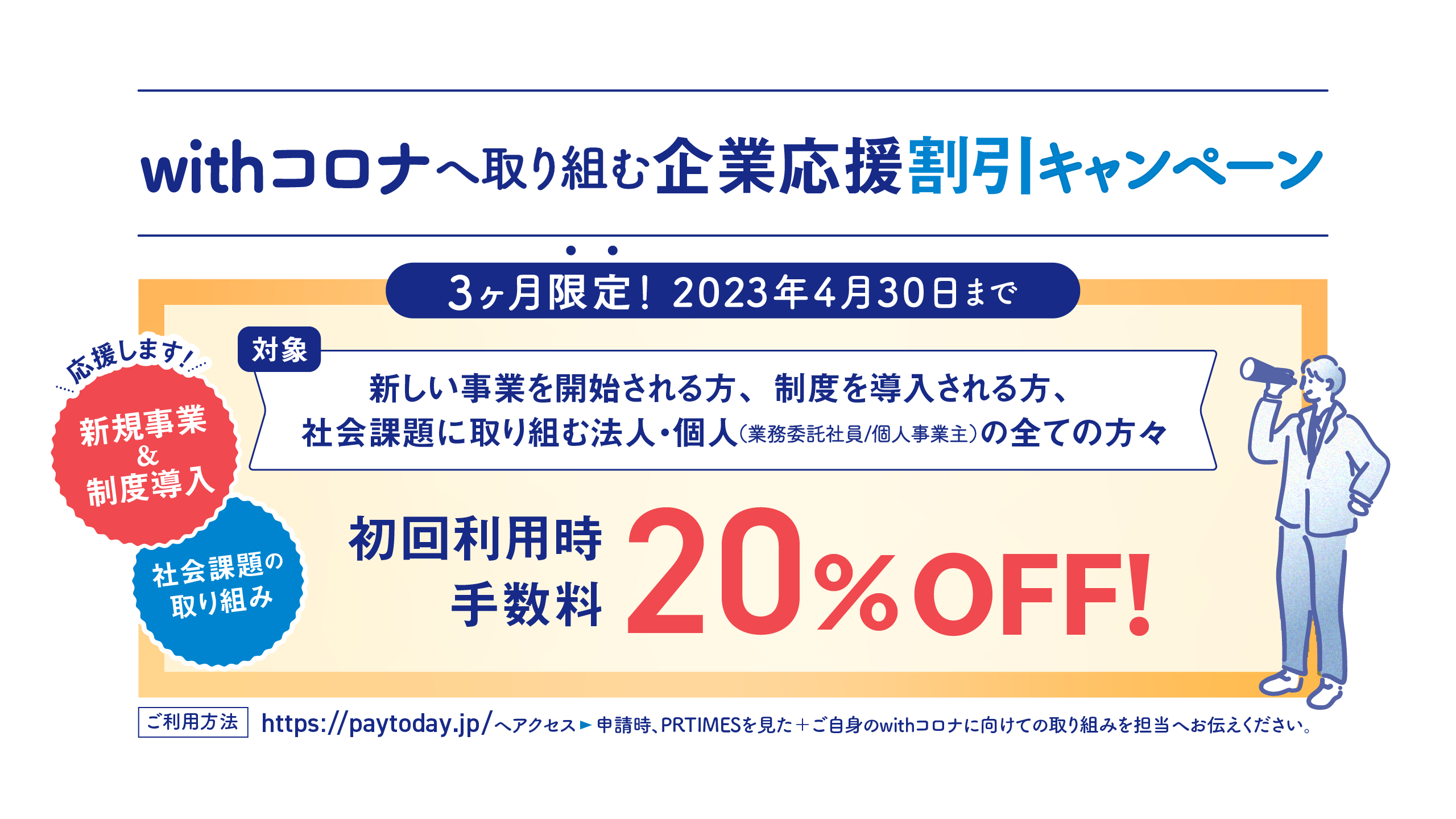 ・ご利用方法: https://paytoday.jp/ へアクセス▶申請時、PRTIMESを見た+ご自身のWithコロナに向けての取り組みを担当へお伝えください。