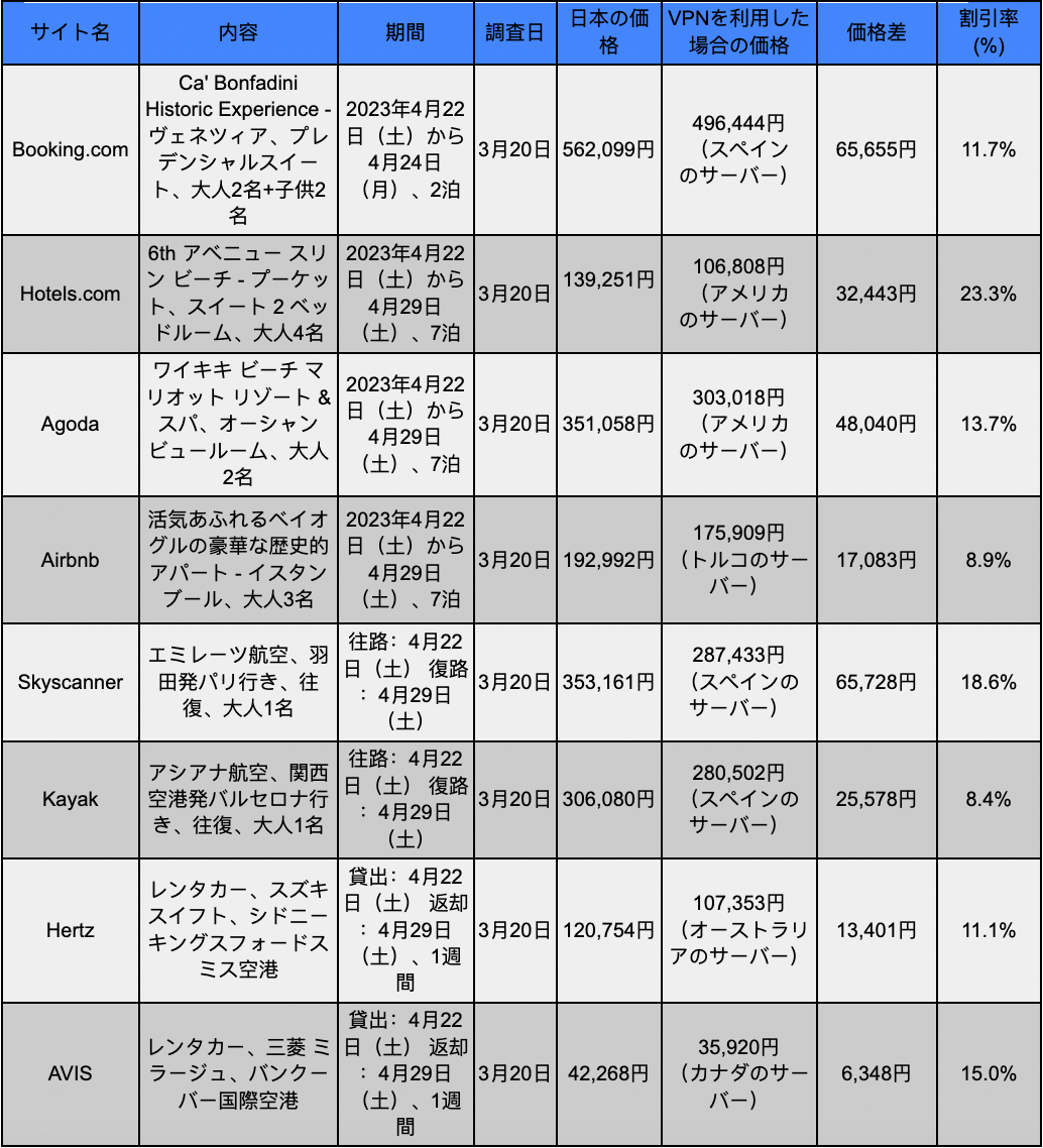NordVPNによる調査では、仮想プライベートネットワーク(VPN)を使用して、日本以外の国のサーバーに接続し、予約サイトにアクセスしました。その結果、Booking.comの5つ星ホテルは約6万5000円(11.7%)、Skyscannerでは約6万5000円(18.6%)、Hertzでは約1万円(11.1%)の割引が確認されました。