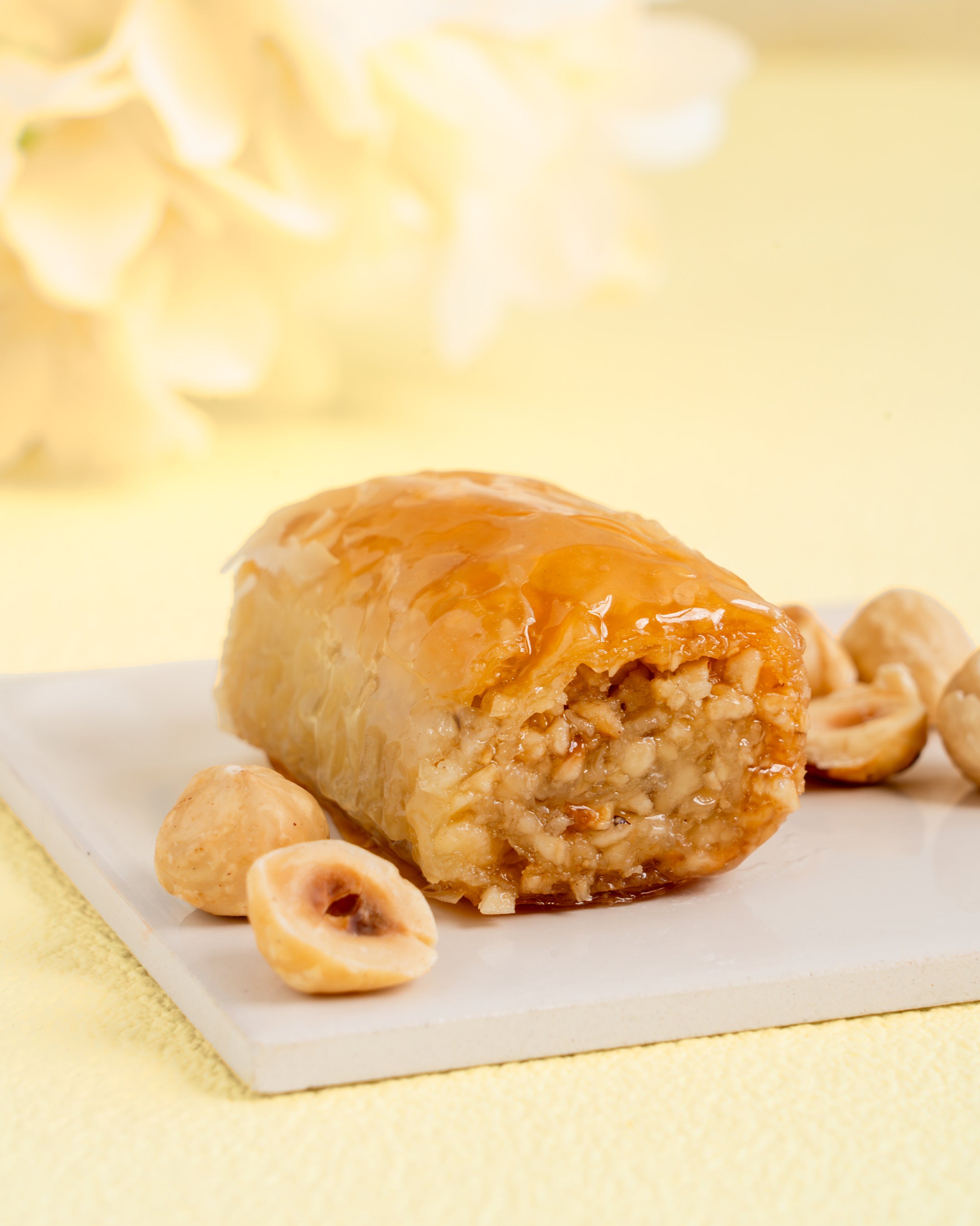 ピスタチオ、くるみに続きヘーゼルナッツが仲間入りしました。ヘーゼルナッツの味わいを存分に楽しめるロールスタイルのバクラヴァです。