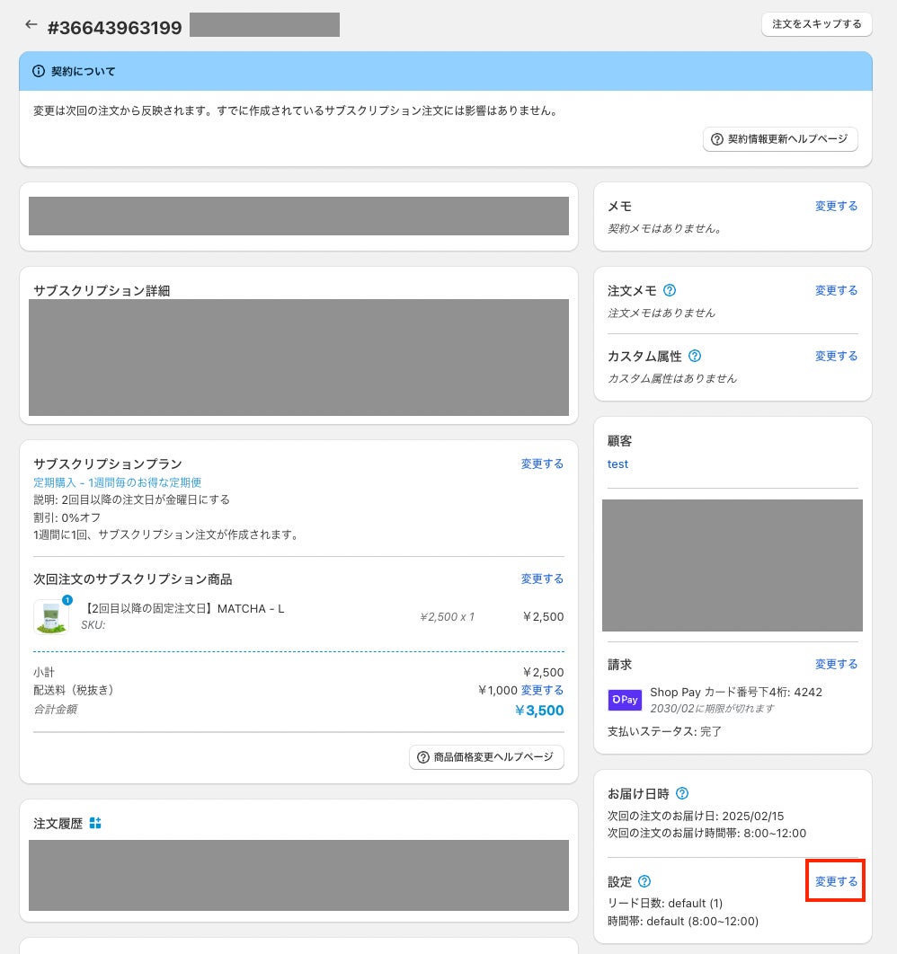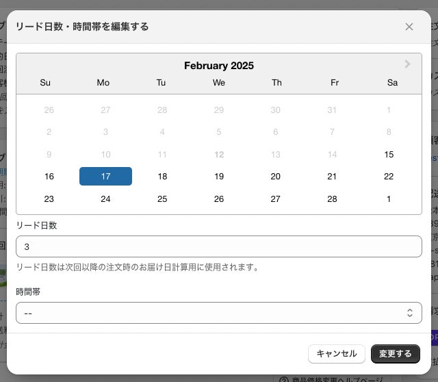 アプリ管理画面の契約詳細ページでお届け日時を変更する際に、これまではリード日数を手動で入力する必要がありましたが、カレンダー表示を追加しました。