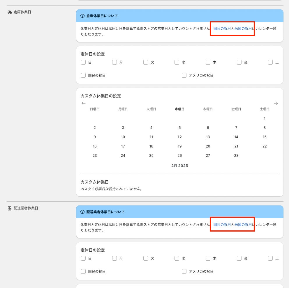 お届け日時の配送休業日と倉庫休業日の設定で、日本と米国の祝日としてカウントされる日付を確認できるようになりました。