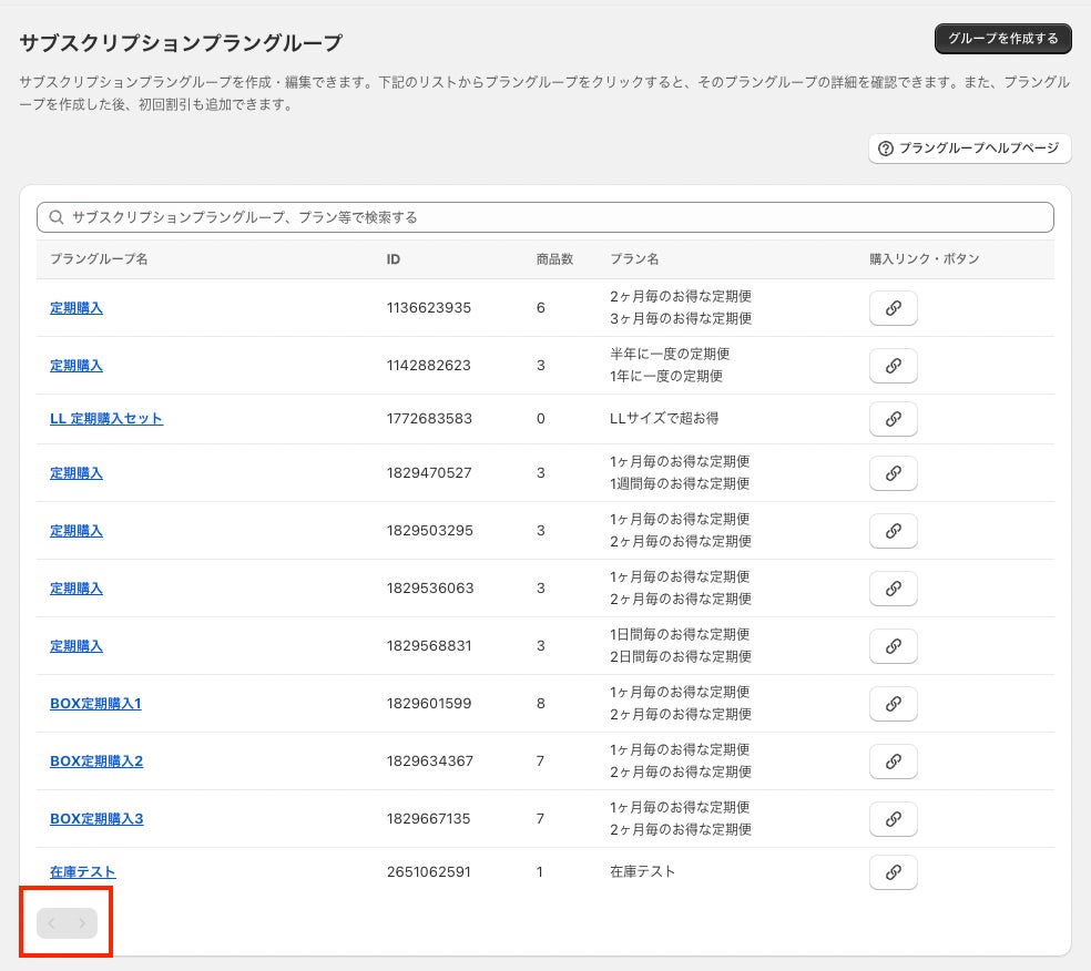 1ページに最大50件のプラングループが表示されます。契約情報が表示されます。