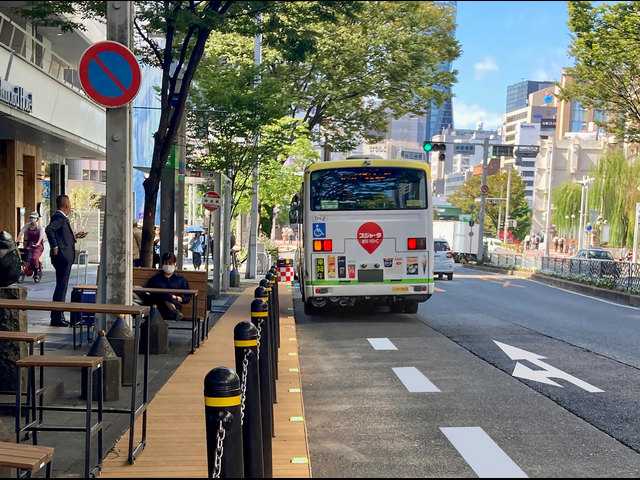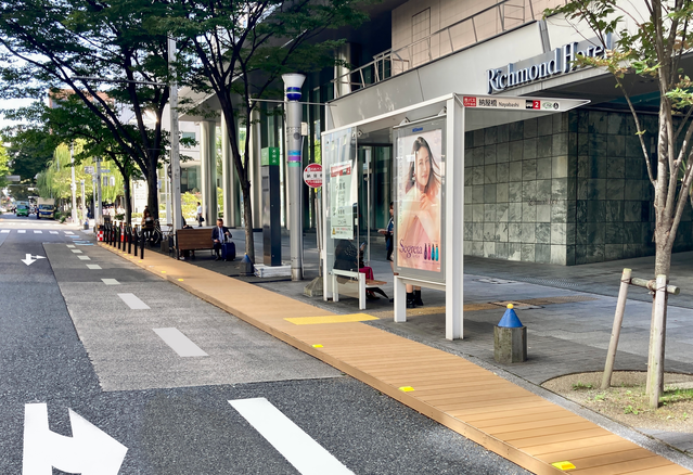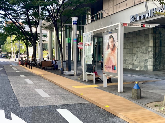 本実験では、2023年9月16日(土)~11月30日(木)に、名古屋市広小路通のバス停2カ所(納屋橋・広小路本町)を「なごまちテラス」として暫定的に整備し、バスの乗降のしやすさ、まちの回遊拠点としての機能、一般交通への影響の検証を行います。