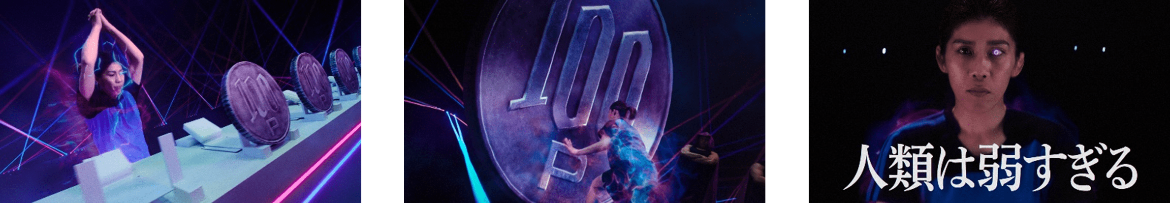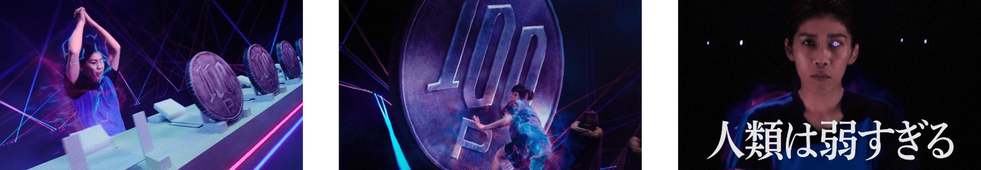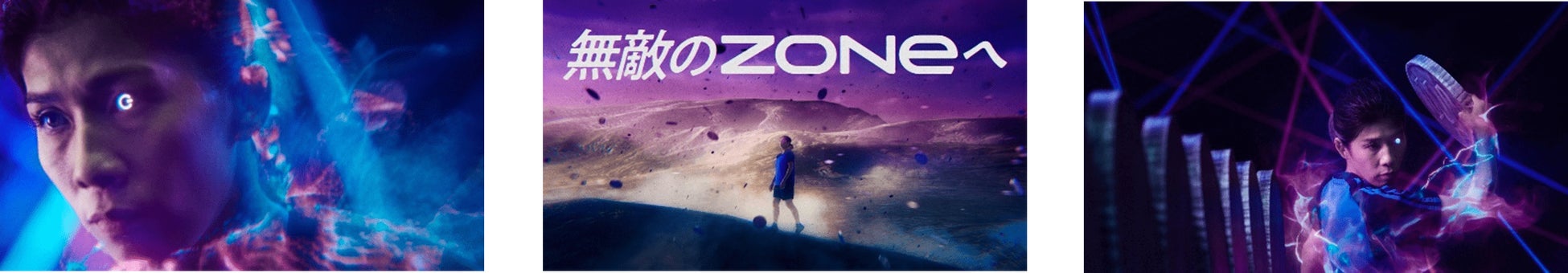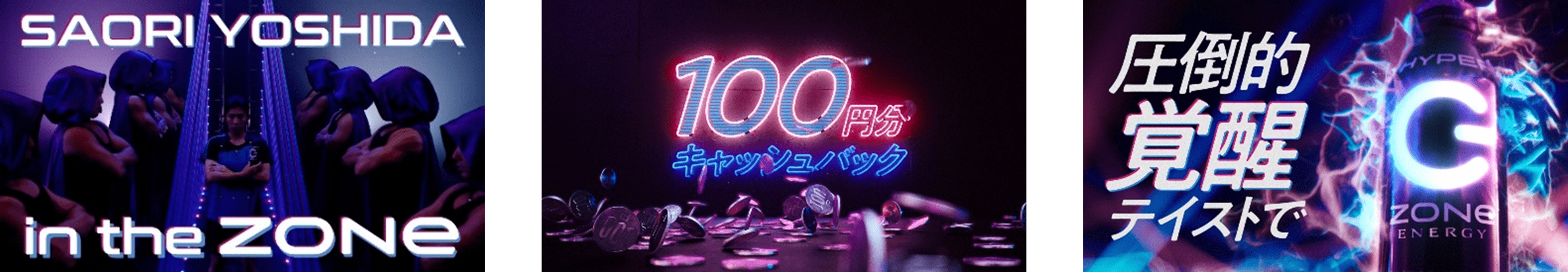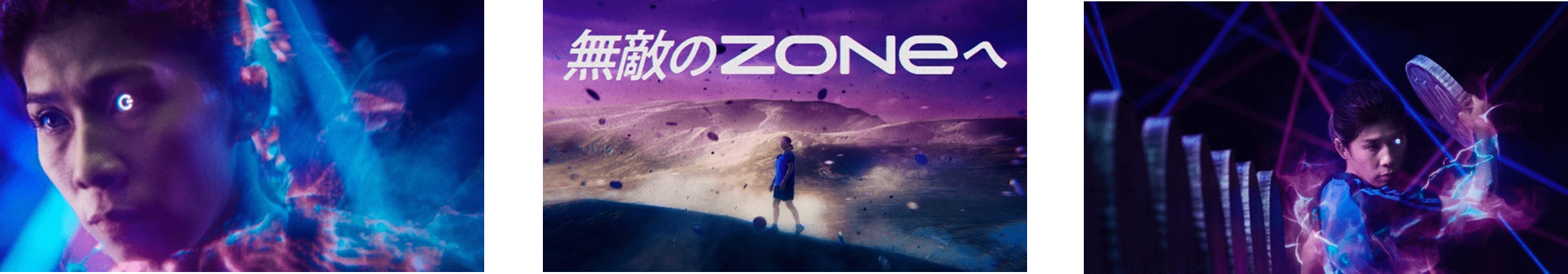 本CMは、デザインリニューアルした「HYPER ZONe」のパッケージデザインを想起させる紫と青のレーザービームが飛び交う、美しく幻想的な世界観で展開されています。ファーストカットはオーラに包まれた吉田さんが君臨するシーンからスタートし、”霊長類最強”の名にふさわしい圧倒的なパワーで次々とコインを吹き飛ばしていきます。最後の強敵となる巨大なコインと直面した際は、ゾーンに入った吉田さんが現役時代さながらのパワフルなタックルでなぎ倒し、「人類は弱すぎる」「最強になって」と、力強く「HYPER ZONe」を飲み上げる吉田さんの姿が収められています。霊長類最強のオーラをまとった吉田さんの力強いアクションにご注目ください。