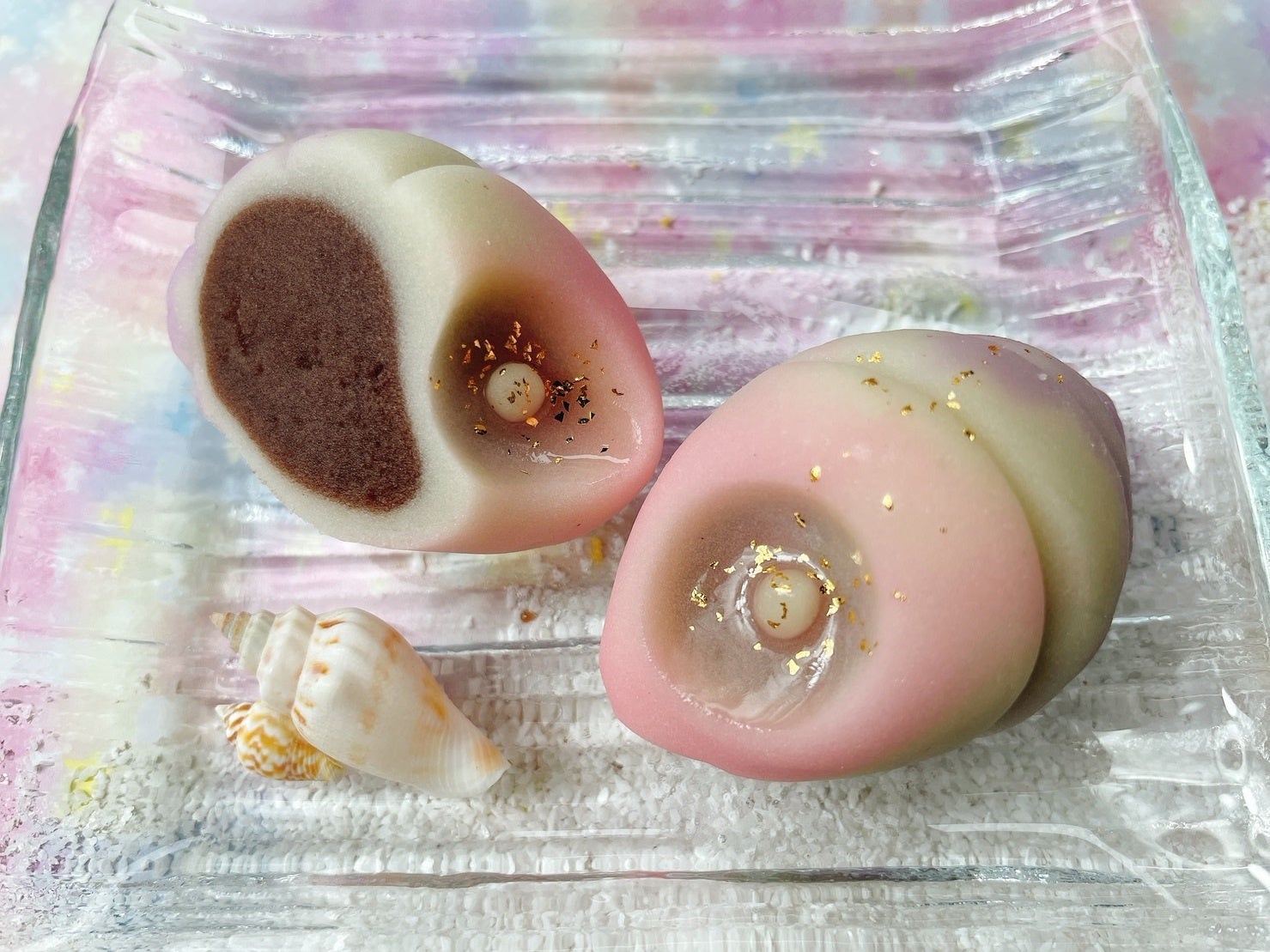 和菓子の道具を使い、巻貝の形に成形し、海辺を表現するために凹ませた部分に透明の寒天と砂糖を煮詰めた錦玉羹を流し込みました。実際には「貝殻」には存在しないのですが、メルヘンなイメージで巻き貝の凹みに真珠(練り切り)を一粒乗せ、仕上げに星の砂をイメージした金箔を散らしました。