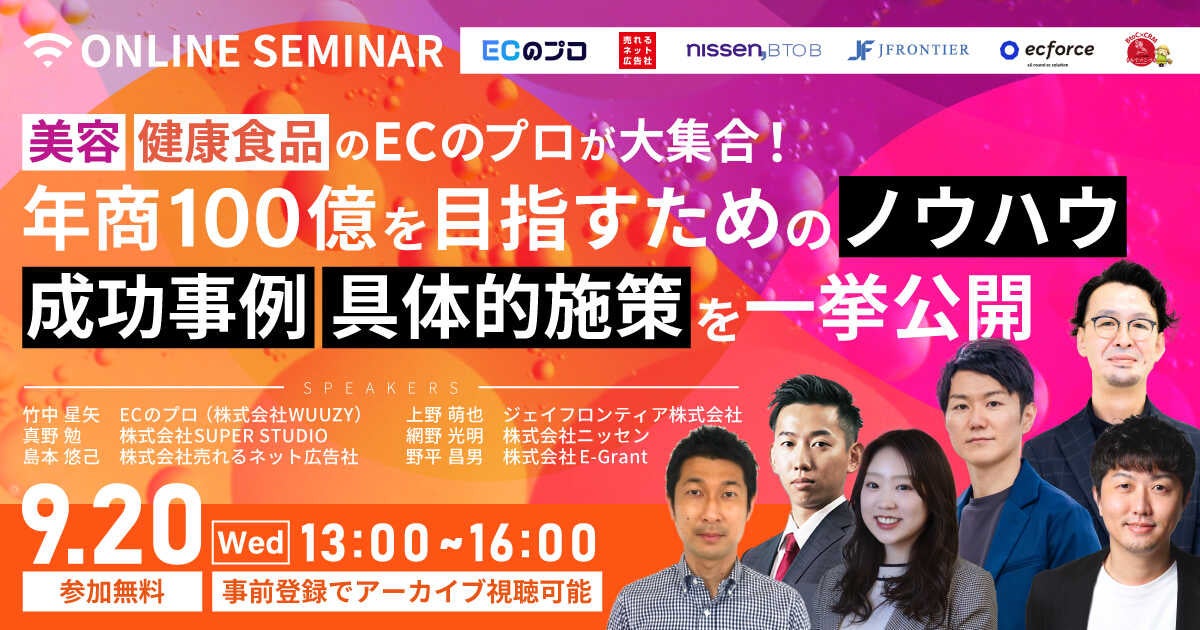 【9月20日(水)13:00】無料ウェビナー『美容・健康食品の“ECのプロ”が大集合! 年商100億を目指すための施策を一挙公開』を来週開催 !