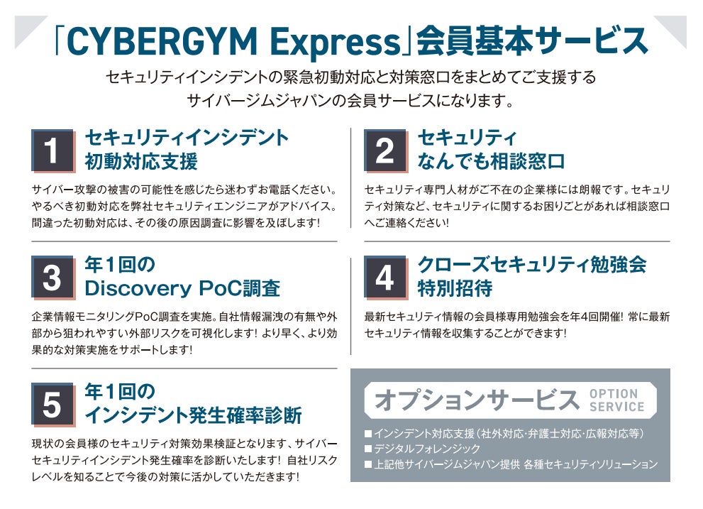 「CYBERGYM Express」は、イスラエルの実践的なトレーニングを受けたセキュリティエンジニアが、セキュリティインシデントの初動対応を支援する会員サービスです。