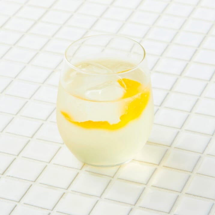 ■材料:シャルドネビネガー 20cc / 柚子果汁 10cc / 柚子皮 少々 / ソーダ 100cc / 氷