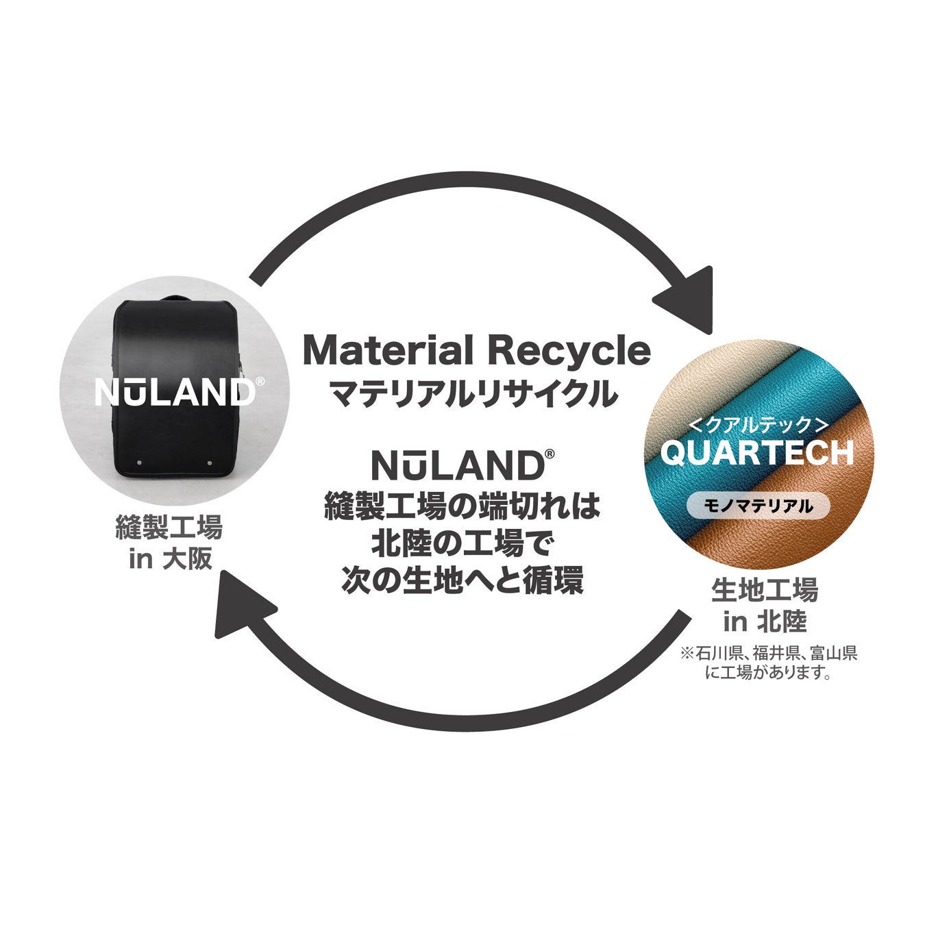 最大の注目は、石川県で誕生し今まさに世界に向けて展開していく最先端のリサイクル生地QUARTECH<クアルテック>をNuLAND®が初の製品化。またNuLAND®の縫製工場(大阪)から出す端切れを回収し次の生地へと循環させる新しい挑戦「マテリアルリサイクル」もスタートし、NuLAND®が持続可能な社会に貢献できる一歩を踏み出します。