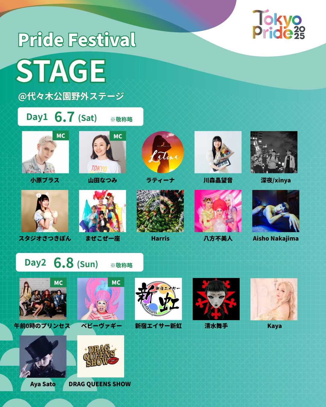 特定非営利活動法人東京レインボープライド(所在地:東京都新宿区、共同代表理事:山田 なつみ、佐藤 ユウコ、以下TRP)は、2025年6月7日(土)・6月8日(日)に代々木公園イベント広場にて開催する「Tokyo Pride 2025 Pride Parade & Festival(トウキョウプライド・ニーゼロニーゴー プライドパレード&フェスティバル)」において、ステージ登壇者・パフォーマンスアーティストが決定したことをお知らせします。