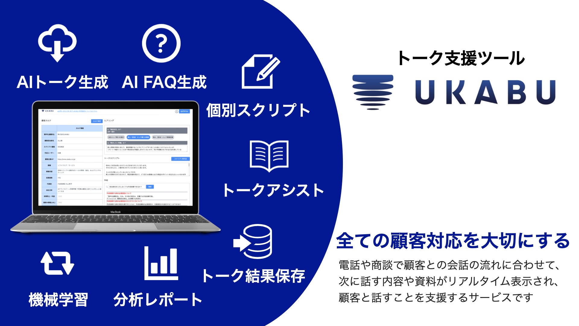 情報が溢れる中で自分にあったモノを探しきれずにいる顧客に、個別の提案やサポートを誰もができるようにすることで、機会損失を少なくする。雰囲気や感覚だけではなく、営業が“伝える内容“次第で、顧客はもっと意思決定ができるはず。AIテクノロジー × リアルタイムコミュニケーション支援 で「営業は顧客と話すことがもっと楽しくなる」営業トーク支援ツール「UKABU(ウカブ)」の開発、販売をしています。