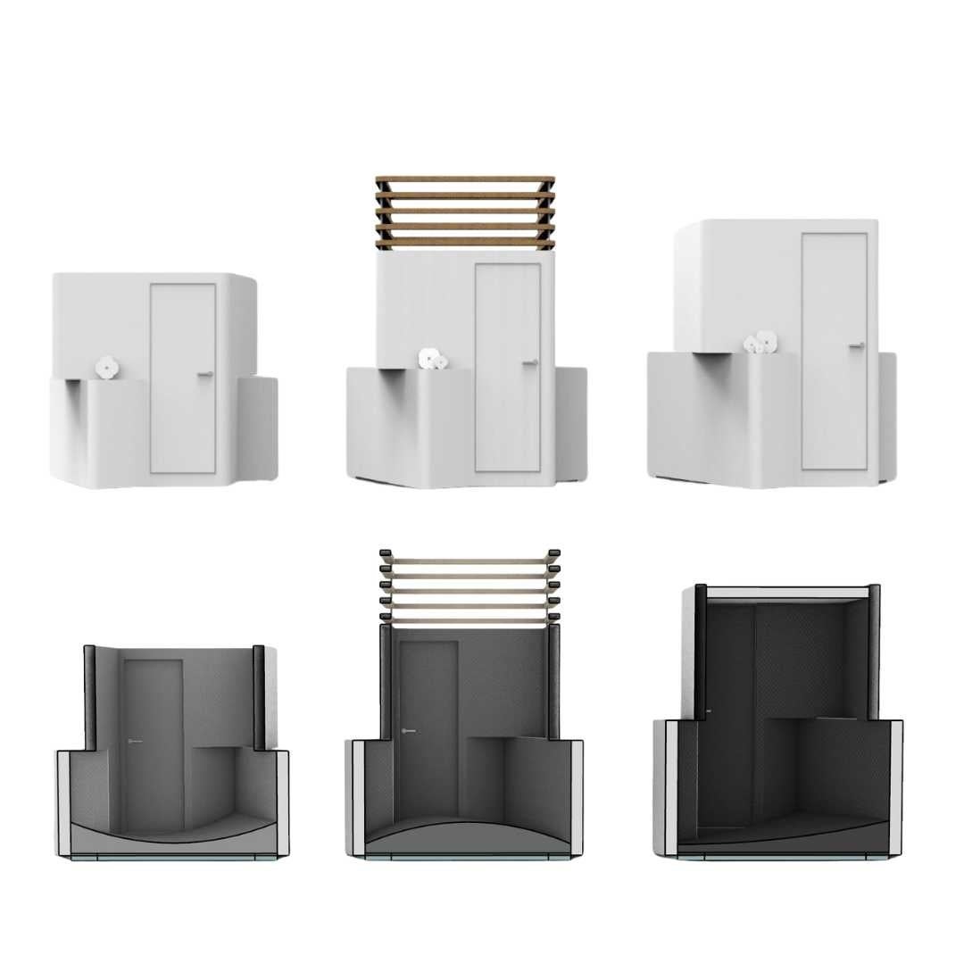 ディバイスの持ち込み禁止等、少し仕事から離れ、人の目を気にする事なくセルフメンテナンスを目的としたこのブースは、同事業内のプロジェクトであるオールジェンダートイレの考え方「後ろめたさの解消」を実現するため、休憩スペースがエリアで区切られているのではなく、通常執務するオフィス内に設置され、入口と出口を分ける事で使用者同士が顔を合わせないで済むようになっています。