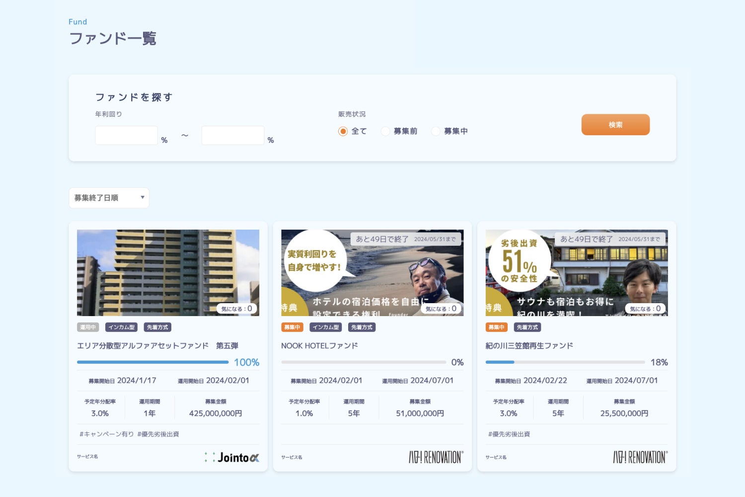 ファインディングファンドでは、年利回りや販売状況から、あらゆるファンドを一覧検索することができます。