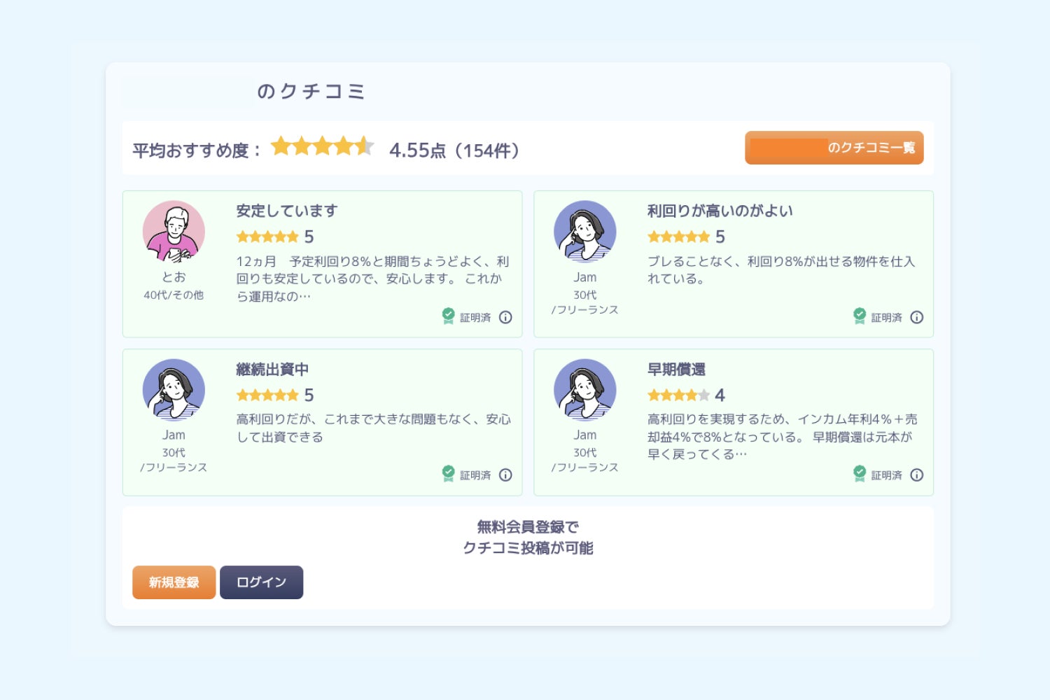 さらにファインディングファンド運営会社であるレプスと契約・連携することで、クチコミ投稿者が出資実績があるか証明できる仕組みも提供しています。出資証明付きのクチコミを優先的に表示することで、より信用度の高いクチコミを目立つように掲載することができます。