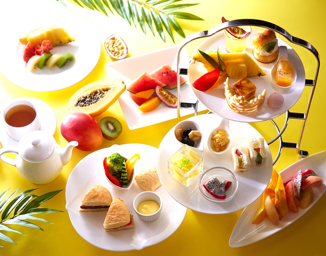 トロピカルフルーツの品種としてはパイン、パパイヤ、ドラゴンフルーツ、パッションフルーツなどを中心としたメニューをご提供いたします。国産マンゴー(主に沖縄、宮崎など)は、必ずアフタヌーンティーの最上段にしつらえてあります。(※食べ放題カットフルーツでの国産マンゴーの提供はございません。)