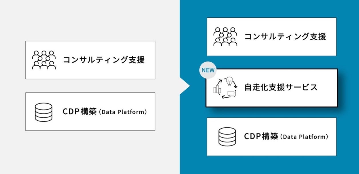 新しく提供するサービスフレームは、従来の「CDP構築」と「コンサルティング支援」に「自走化支援サービス(※1)」を加えた三位一体のサービスフレームです。従来は「CDPを活用したデータ分析基盤構築・運用」と「データ領域における戦略策定や施策実行のためのコンサルティング支援」により、企業のデータ活用の促進を伴走支援してきました。