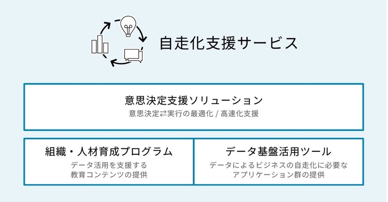 「自走化支援サービス」は、データ基盤活用ツール、組織・人材育成プログラム、意思決定支援ソリューションの三つの要素で構成されています。現時点では開発段階となりますが、具体的にご案内できる段階となりましたら順次プレスリリースなどにて発表させていただきます。