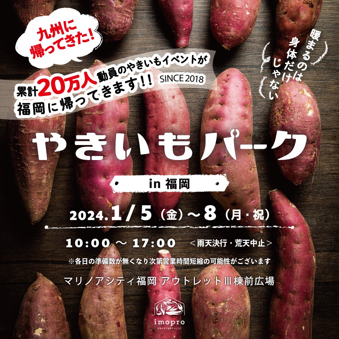 「やきいもパーク」はimoproがセレクトした、その時一番美味しい 品種をお届けする、やきいもをこよなく 愛する人々の為のやきいもイベントです。2018年に兵庫県神戸市で初開催して以来、大阪・仙台・岡山・福岡・高知・岐阜など各地で開催し、累計20万人にご来場いただきました。本イベントの福岡での開催は昨年2022年が初で、今回が2回目となります。前回もたくさんのお客様にご来場いただいたことから、今回再び福岡で開催することが決定しました。「やきいもパーク」としては12回目の開催となります。