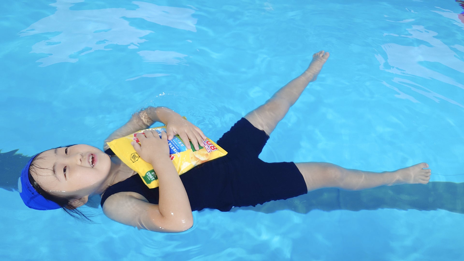 また、練習に使用したポテトチップスは、そのまま子どもたちがお土産として持ち帰ります。終了後、ポテトチップスを食べながら、家族やお友達と「浮く体験」をお話をすることで、さらに水難事故予防の意識を高めることができればと考えています。
