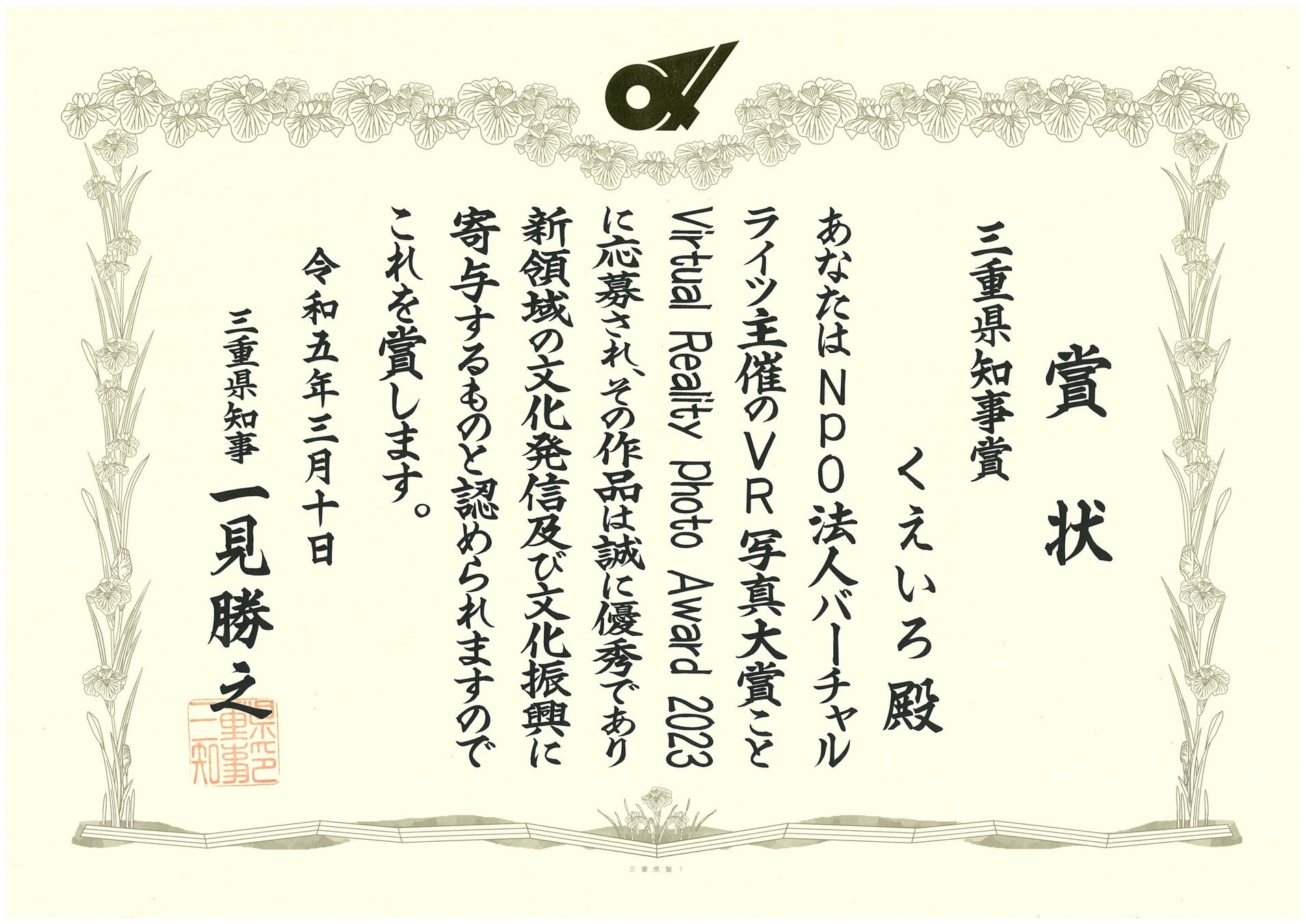 昨年に続き、当団体が主催する「VR写真大賞」の最優秀賞受賞者に三重県知事賞が授与されたことは大きな意味を持つと考えております。VRに係るフォトコンテストは多数開催されていますが、行政府の後援、賞の交付を得ているのは当コンテストのみであり、VR文化を一般に向けて発信するという目的に大きく寄与していると感じます。当コンテストは、群馬県や独立行政法人国際協力機構など多くの行政機関のVR進出を支援することに繋がっており、内外から高い評価を頂いておりますので、引き続き、同様の活動を行っていきたいと思います。