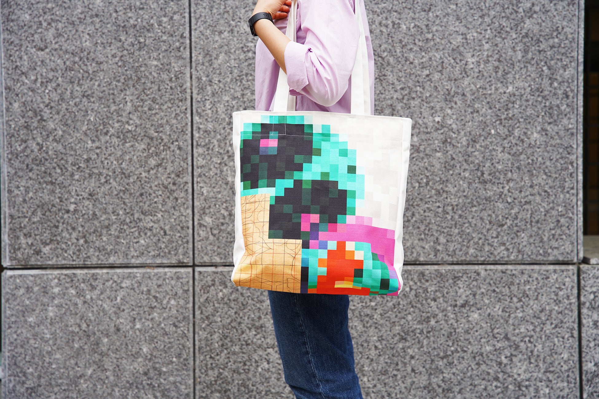 メインビジュアルをベースにしたデザインで、サイズも少し大きめのユニセックスで使えるトートバックです。ただいま京都伝統産業ミュージアムショップおよびMOCADオンラインショップ(https://mocad-shop.com/collections/exhibitions)にて予約を受付中です。