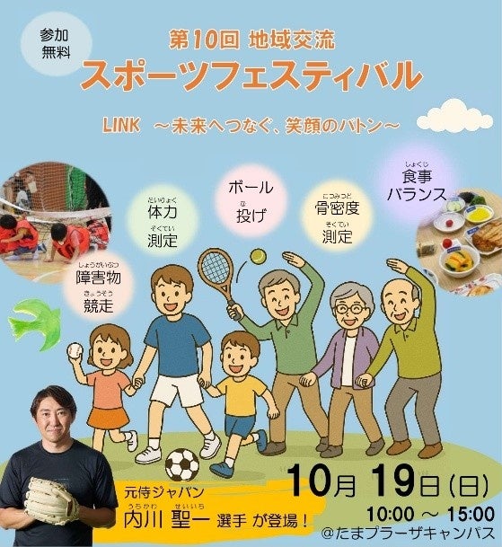 國學院大學人間開発学部・地域ヘルスプロモーションセンターは、地域の方々と学生が「健康」と「スポーツ」を通じて交流する「第10回 地域交流スポーツフェスティバル」を開催します。会場では、子どもからシニアまで楽しめる体験プログラムが9種類提供されるほか、第10回記念の特別ゲストとして、元プロ野球選手・内川聖一氏、元プロサッカー選手・鈴木隆行氏を招いた特別プログラムも実施予定です。
