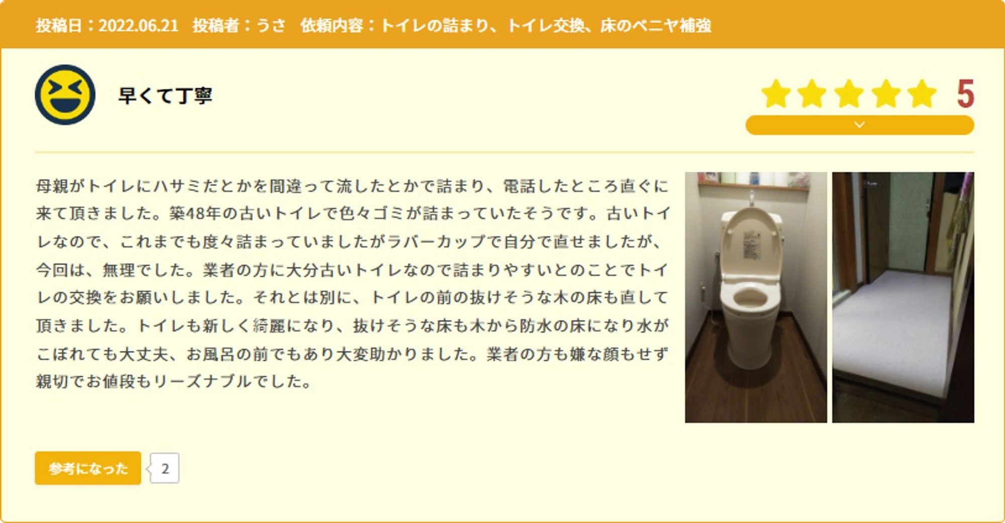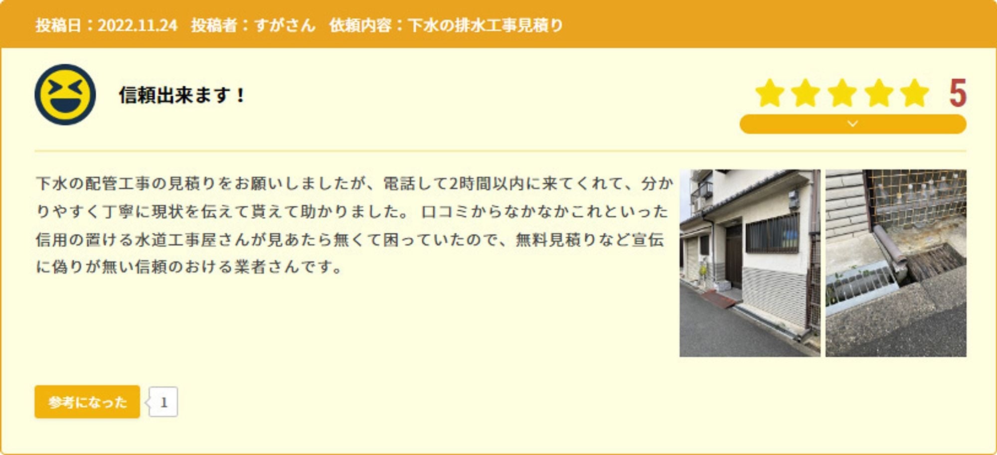 厳しい審査を通過した優良な水道事業者だけを掲載していることに加えて、独自のアルゴリズムで評価した水道事業者の口コミ評価(画像付きの口コミもあり、比較検討がしやすくなっています)や、料金による事業者比較などがスムーズにできるようになっています。