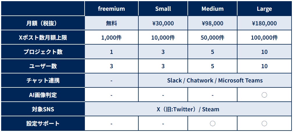 より手軽にSNS自動監視ツールをご活用いただきたいという思いから、無料で導入が可能になりました。料金プランごとにご利用いただける機能を区分けしており、お問い合わせの手間をかけずスムーズにサービスをご利用いただけます。