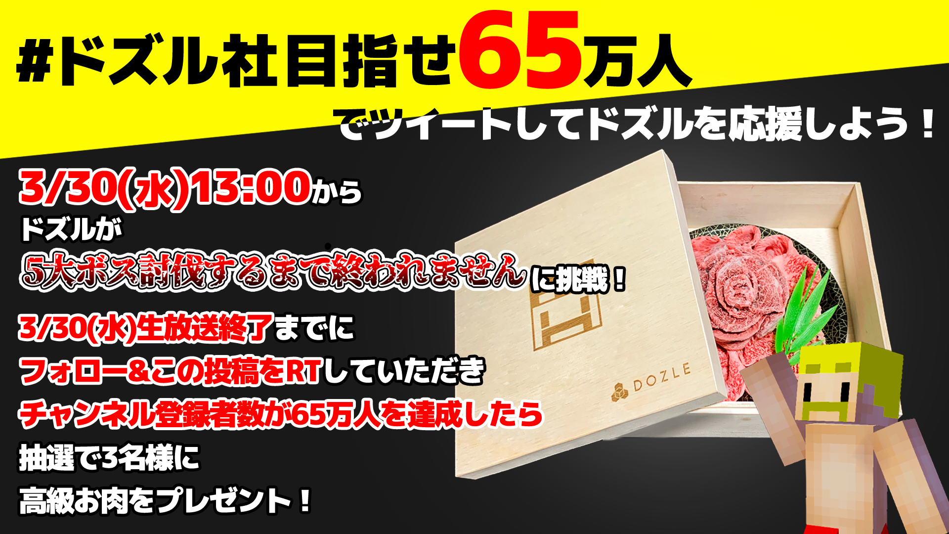 YouTubeチャンネル「ドズル社」のチャンネル登録者65万人達成を目指し、ゲーム「Minecraft」のボス5体を倒す長時間生放送を3/30(水)に開催!