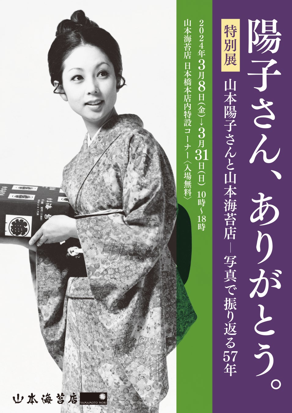 株式会社山本海苔店(本社:東京都中央区/代表取締役社長:山本貴大)は、2月20日に逝去された、弊社イメージモデルを57年もの間務めていただいた山本陽子さんを偲び、3月8日(金)~3月31日(日)に日本橋本店にて特別展を開催いたします。