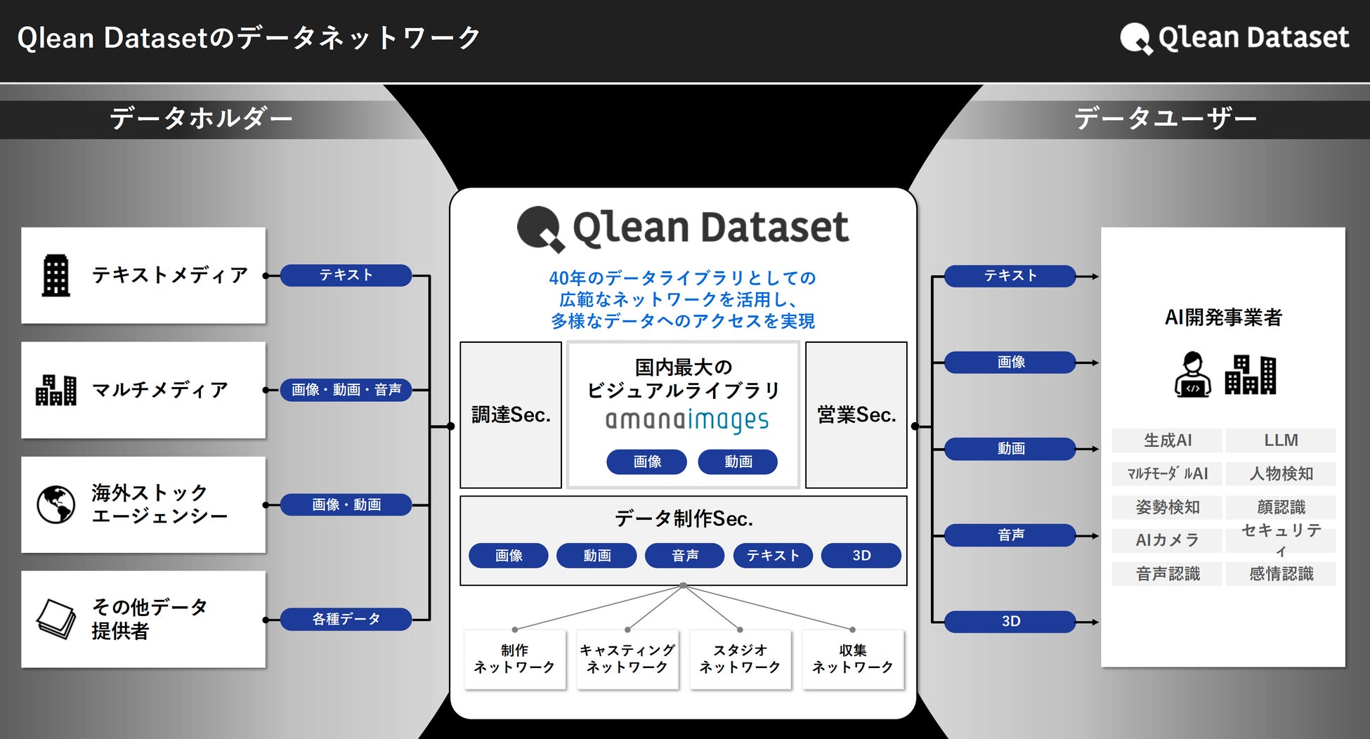 『Qlean Dataset』は創業40年を超える株式会社アマナイメージズの監修を通じて「画像・動画・音声・テキスト・3Dデータなど2.4億点以上のデータの権利管理」を行っており、そのアセットをデータセット開発に活用しています。これまでに培った広告・出版・報道・Web制作業界など幅広い分野へのデータ素材提供の実績や厳格な権利管理の仕組みを基盤としながらサービス提供を推進しています。